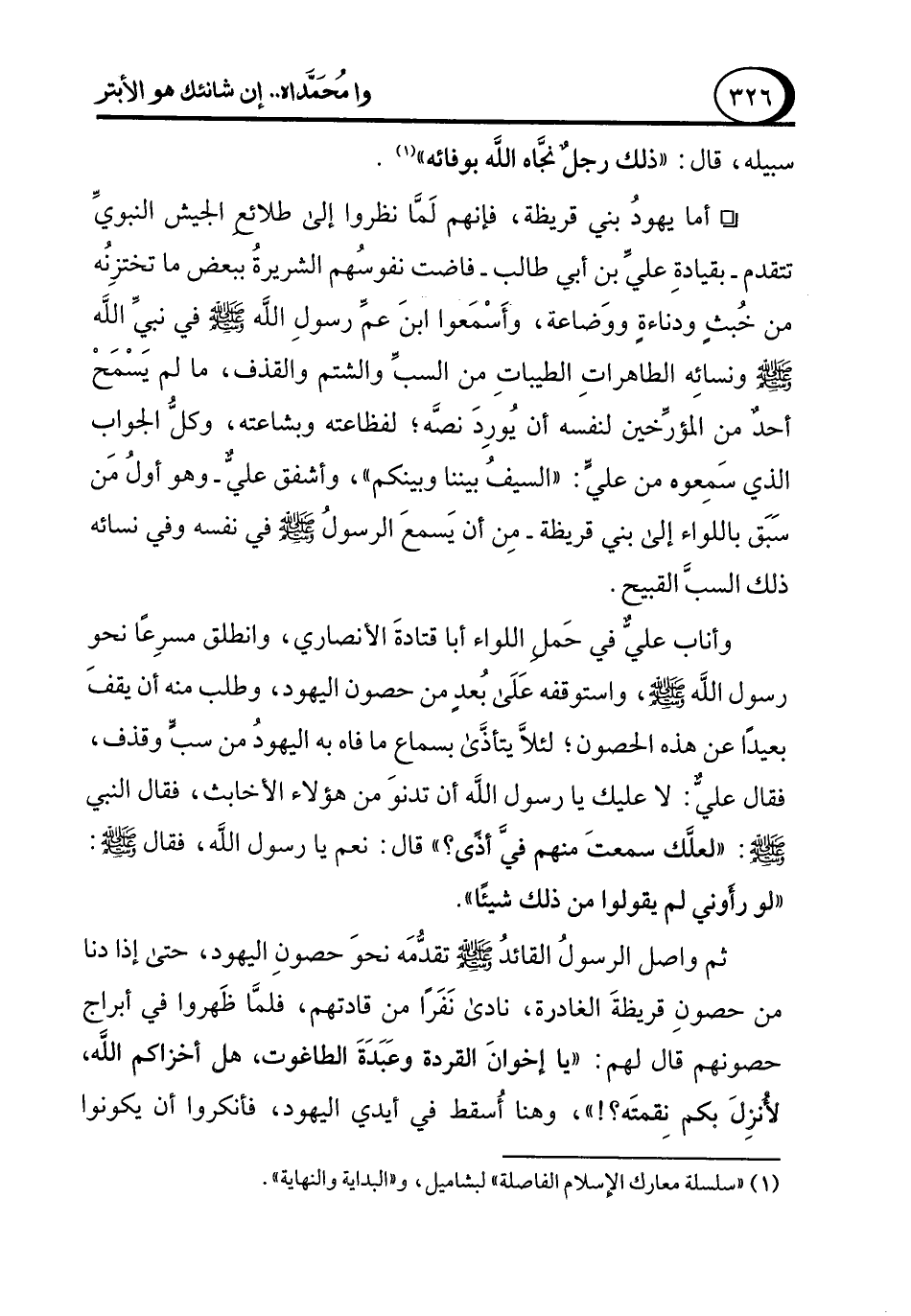 ° أما يهودُ بني قريظة، فإنهم لَمَّا نظروا إلى طلائع الجيش النبويِّ تتقدم -بقيادةِ عليِّ بن أبي طالب- فاضت نفوسُهم الشريرةُ ببعض ما تختزِنُه من خُبثٍ ودناءةٍ ووَضاعة، وأَسْمَعوا ابنَ عمِّ رسولِ الله - صلى الله عليه وسلم - في نبيِّ الله - صلى الله عليه وسلم - ونسائه الطاهراتِ الطيباتِ من السبّ والشتم والقذف، ما لم يَسْمَحْ أحدٌ من المؤرِّخين لنفسه أن يُورِدَ نصَّه؛ لفظاعته وبشاعته، وكلُّ الجواب الذي سَمِعوه من عليٍّ: "السيفُ بيننا وبينكم"، وأشفق عليٌّ -وهو أولُ مَن سَبَق باللواء إلى بني قريظة- مِن أن يَسمعَ الرسولُ - صلى الله عليه وسلم - في نفسه وفي نسائه ذلك السبَّ القبيح.