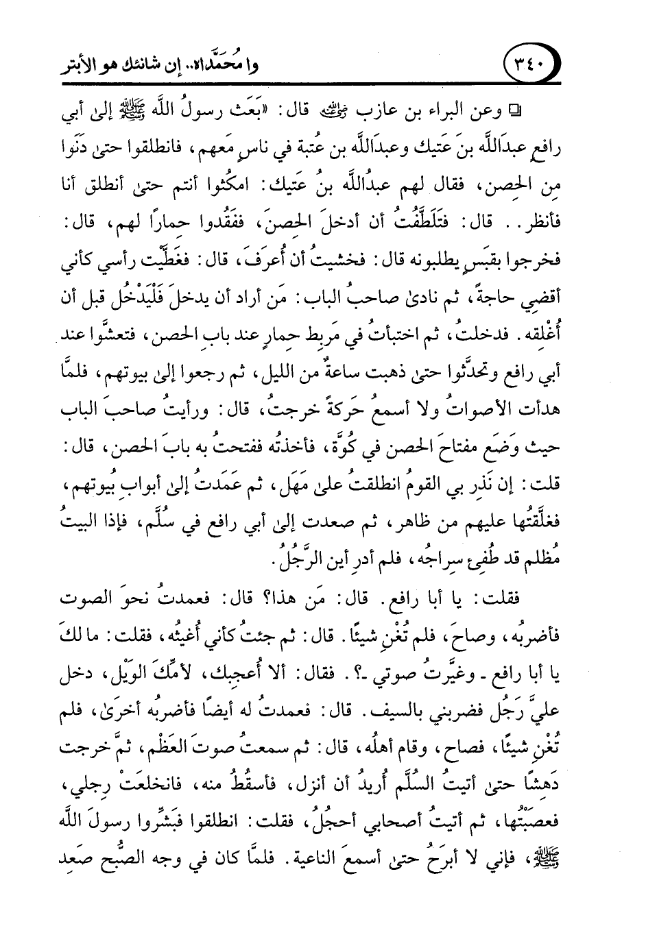 فقلت: يا أبا رافع. قال: مَن هذا؟ قال: فعمدتُ نحوَ الصوت فأضربُه، وصاحَ، فلم تُغْنِ شيئًا. قال: ثم جئتُ كأني أُغيثُه، فقلت: ما لكَ يا أبا رافع -وغيَّرتُ صوتي-؟. فقال: ألا أُعجِبك، لأمِّكَ الوَيْل، دخل علي رَجُل فضربني بالسيف. قال. فعمدتُ له أيضًا فأضربُه أخرَى، فلم تُغْنِ شيئًا فصاح، وقام أهله، قال: ثم سمعت صوتَ العَظْم، ثمَّ خرجت دَهِشًا حتى أتيتُ السلَّم أُريدُ أن أنزل، فأسقطُ منه، فانخلعَتْ رِجلي، فعصَبْتُها، ثم أتيتُ أصحابي أحجُل، فقلت: انطلقوا فبَشَروا رسولَ الله - صلى الله عليه وسلم -، فإني لا أبرَحُ حتى أسمعَ الناعية. فلمَّا كان في وجه الصُّبح صَعِد