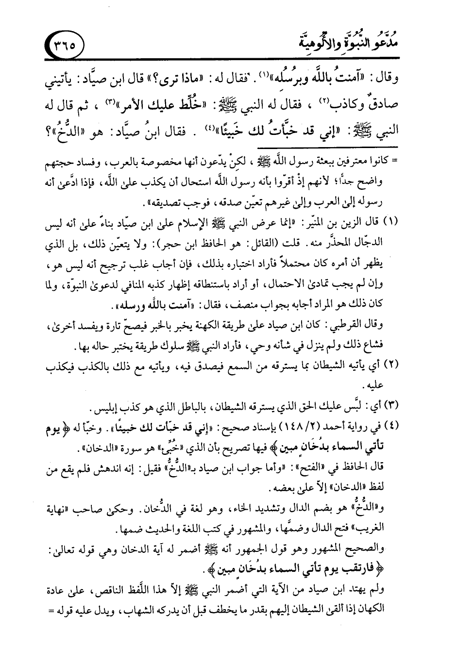 (¬1) قال الزين بن المنير: "إنما عرض النبي - صلى الله عليه وسلم - الإسلام على ابن صياد بناءَ على أنه ليس الدجّال المحذَّر منه. قلت (القائل: هو الحافظ ابن حجر): ولا يتعيّن ذلك، بل الذي يظهر أن أمره كان محتملاً فأراد اختباره بذلك، فإن أجاب غلب ترجيح أنه ليس هو، وإن لم يجب تمادى الاحتمال، أو أراد باستنطاقه إظهار كذبه المنافي لدعوى النبوة، ولما كان ذلك هو المراد أجابه بجواب منصف، فقال: "آمنت بالله ورسله".