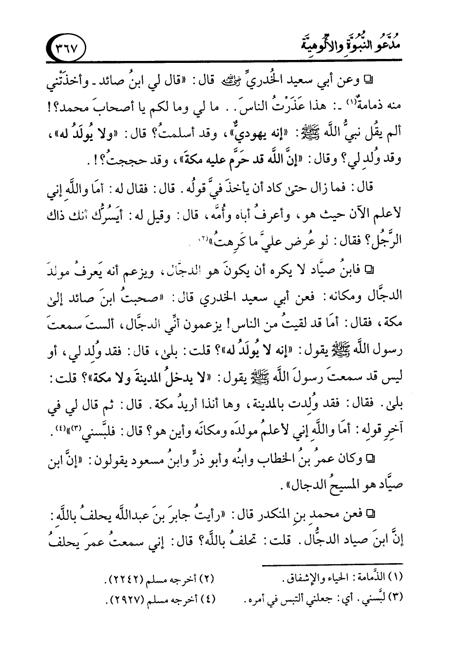 وعن أبي سعيد الخُدريِّ - رضي الله عنه - قال: "قال لي ابنُ صائد -وأخذَتْني منه ذمامةٌ (¬1) -: هذا عَذَرْتُ الناسَ .. ما لي وما لكم يا أصحابَ محمد؟! ألم يقُل نبيُّ الله - صلى الله عليه وسلم -: "إنه يهوديٌّ"، وقد أسلمتُ؟ قال: "ولا يولَدُ له"، وقد وُلدِ لي؟ وقال: "إنَّ الله قد حَرَّم عليه مكةَ"، وقد حججتُ؟!.