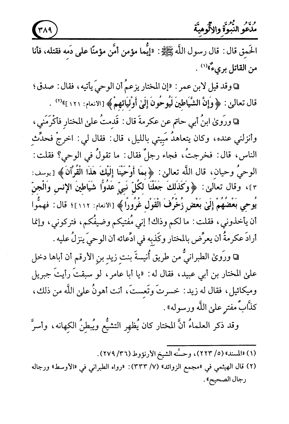 * ورَوى ابنُ أبي حاتم عن عكرمةَ قال: قَدِمتُ على المختارِ فأكْرَمَني، وأنزلني عنده، وكان يتعاهدُ مَبِيتي بالليل، قال: فقال لي: اخرجْ فحدِّثِ الناس، قال: فخرجتُ، فجاء رجل فقال: ما تقولُ في الوحي؟ فقلت: الوحيُ وحيانِ، قال الله تعالى: {بِمَا أَوْحَيْنَا إِلَيْكَ هَذَا الْقُرْآنَ} [يوسف: 3]، وقال تعالى: {وَكَذَلِكَ جَعَلْنَا لِكُلِّ نَبِيٍّ عَدُوًّا شَيَاطِينَ الْإِنْسِ وَالْجِنِّ يُوحِي بَعْضُهُمْ إِلَى بَعْضٍ زُخْرُفَ الْقَوْلِ غُرُورًا} [الأنعام: 112] قال: فهمُّوا أن يأخذوني، فقلت: ما لكم وذاك! إني مُفتيكم وضيفُكم، فتركوني، وإنما أرادَ عكرمةُ أن يعرِّض بالمختار وكَذِبِه في ادِّعائه أن الوحيَ ينزلُ عليه.