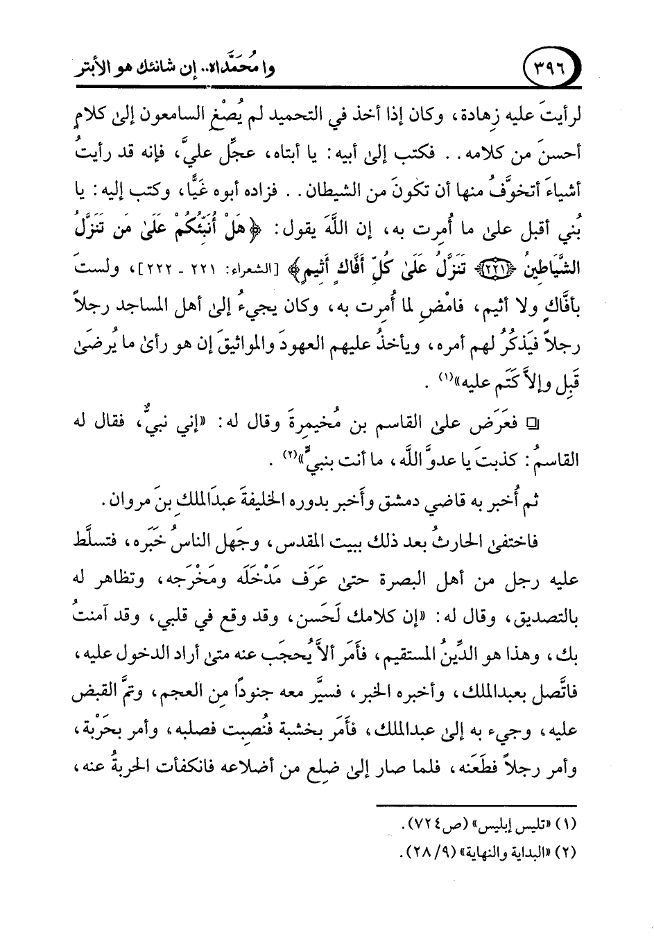 لرأيتَ عليه زِهادة، وكان إذا أخذ في التحميد لم يُصْغ السامعون إلى كلامٍ أحسنَ من كلامه .. فكتب إلى أبيه: يا أبتاه، عجِّل عليَّ، فإنه قد رأيتُ أشياءَ أتخوَّف منها أن تكونَ من الشيطان .. فزاده أبوه غَيّاً، وكتب إليه: يا بُني أقبل على ما أمِرت به، إن اللهَ يقول: {هَلْ أُنَبِّئُكُمْ عَلَى مَنْ تَنَزَّلُ الشَّيَاطِينُ (221) تَنَزَّلُ عَلَى كُلِّ أَفَّاكٍ أَثِيمٍ (222)} [الشعراء: 221 - 222]، ولستَ بأفَّاكٍ ولا أثيم، فامْضِ لما أُمِرت به، وكان يجيءُ إلى أهل المساجد رجلاً رجلاً فيَذكرُ لهم أمره، ويأخذُ عليهم العهودَ والمواثيقَ إن هو رأى ما يُرضَى قَبِل وإلاَّ كَتَم عليه" (¬1).