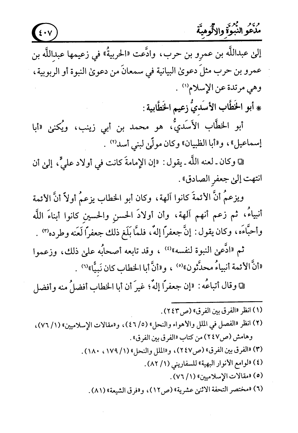 ثم "ادَّعى النبوة لنفسه" (¬4)، وقد تابعه أصحابُه على ذلك، وزعموا "أنَّ الأئمة أنبياءُ محدَّثون" (¬5)، و"أنَّ أبا الخطاب كان نَبِيًّا" (¬6).