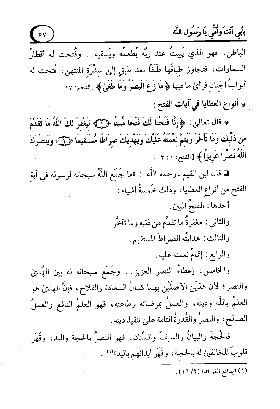 ° قال ابن القيم -رحمه الله-: "ما جَمَع اللهُ سبحانه لرسوله في آيةِ الفتح من أنواع العطايا، وذلك خَمسةُ أشياء: