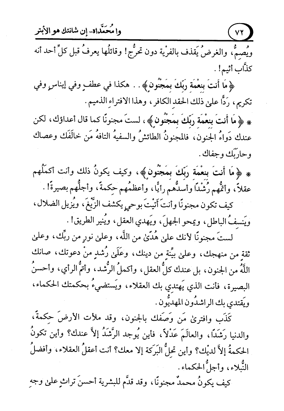 لستَ مجنونًا لأنك على هُدًى من الله، وعلى نورٍ من ربِّك، وعلى ثقةٍ من منهجك، وعلى بيِّنةٍ من دينك، وعَلَى رُشدٍ من دعوتك، صانك اللهُ من المجنون، بل عندك كلُّ العقل، وأكمل الرُّشد، وأتمُّ الرأي، وأحسنُ البصيرة، فأنت الذي يَهتدِي بك العقلاء، ويَستضيءُ بحكمتك الحكماء، ويَقتدي بك الراشدُون المهديُّون.