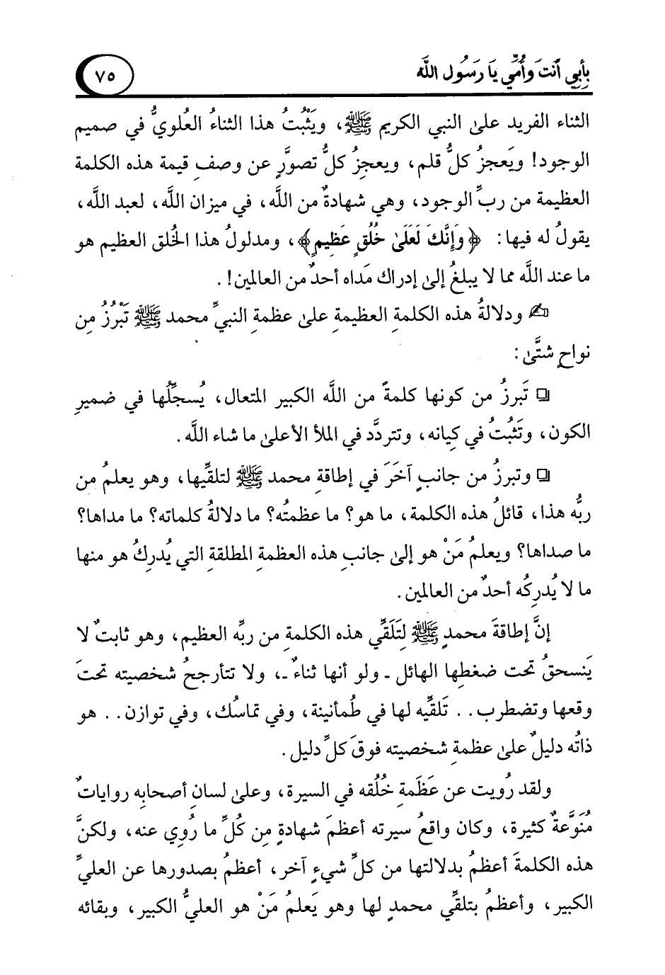الثناء الفريد على النبي الكريم - صلى الله عليه وسلم -، ويَثْبُتُ هذا الثناءُ العُلويُّ في صميم الوجود! وَيعجزُ كلُّ قلم، ويعجِزُ كلُّ تصوَّرٍ عن وصفِ قيمة هذه الكلمة العظيمة من ربِّ الوجود، وهي شهادةٌ من الله، في ميزان الله، لعبد الله، يقولُ له فيها: {وَإِنَّكَ لَعَلَى خُلُقٍ عَظِيمٍ}، ومدلولُ هذا الخُلق العظيم هو ما عند الله مما لا يبلغُ إلى إدراك مَداه أحدٌ من العالمين!.