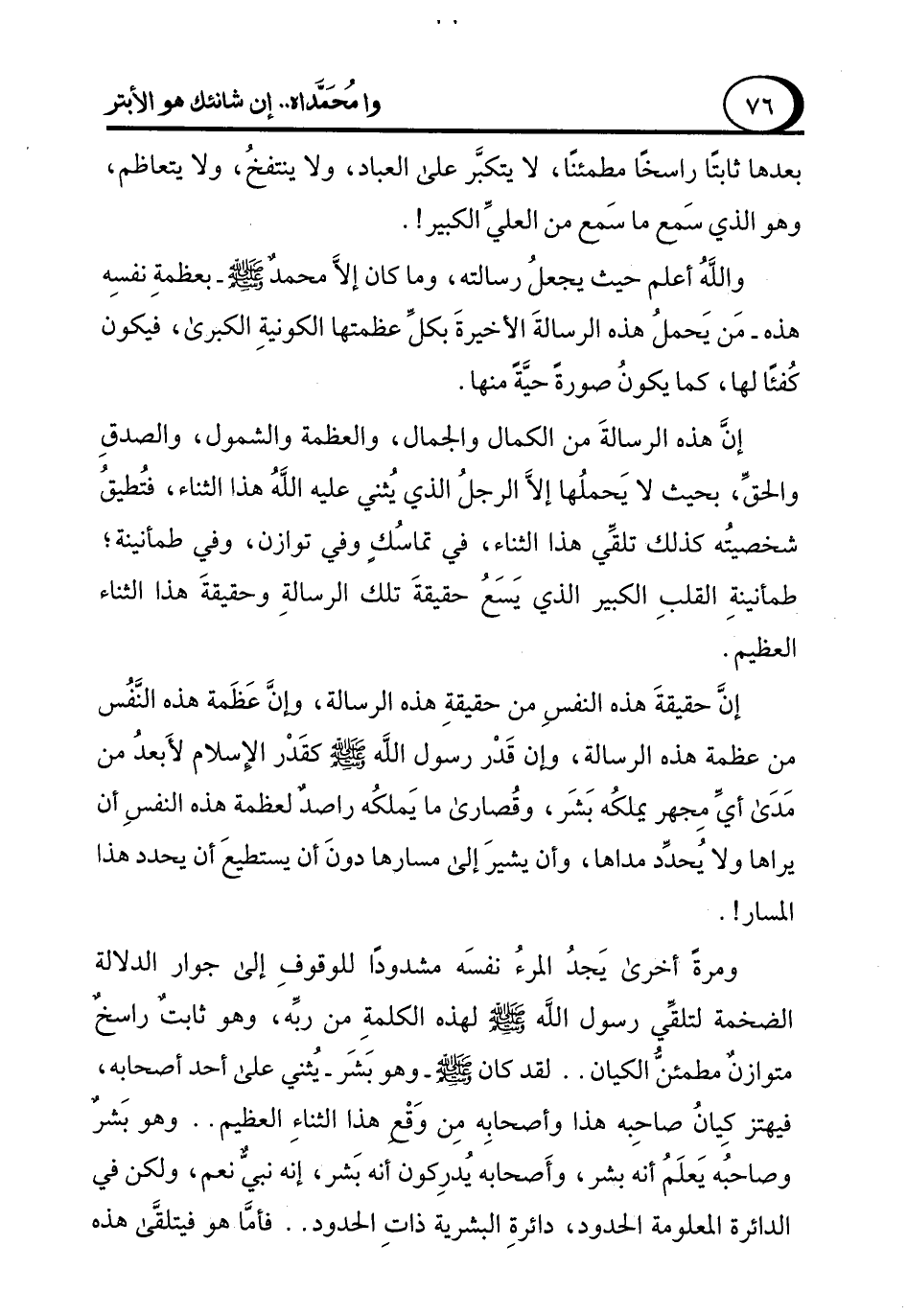 إنَّ حقيقةَ هذه النفسِ من حقيقةِ هذه الرسالة، وإنَّ عَظَمة هذه النَّفُس من عظمة هذه الرسالة، وإن قَدْر رسول الله - صلى الله عليه وسلم - كقَدْر الإسلام لأَبعدُ من مَدَى أيِّ مِجهر يملكه بَشَر، وقُصارى ما يَملكُه راصدٌ لعظمة هذه النفسِ أن يراها ولا يُحدِّد مداها، وأن يشيرَ إلى مسارها دونَ أن يستطيعَ أن يحدد هذا المسار!.