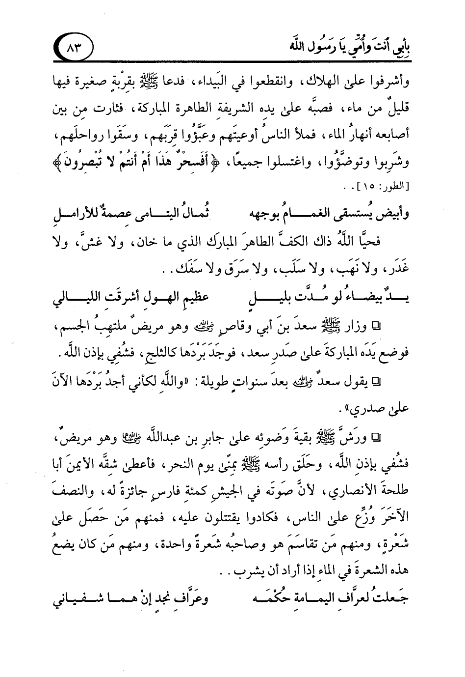 وأشرفوا على الهلاك، وانقطعوا في البَيداء، فدعا - صلى الله عليه وسلم - بقِرْبةٍ صغيرة فيها قليلٌ من ماء، فصبَّه على يده الشريفةِ الطاهرة المباركة، فثارت مِن بين أصابعه أنهارُ الماء، فملأ الناسُ أوعيتَهم وعَبَّؤُوا قِرَبَهم، وسَقَوا رواحلَهم، وشَرِبوا وتوضَّؤُوا، واغتسلوا جميعًا، {أَفَسِحْرٌ هَذَا أَمْ أَنْتُمْ لَا تُبْصِرُونَ} [الطور: 15] ..