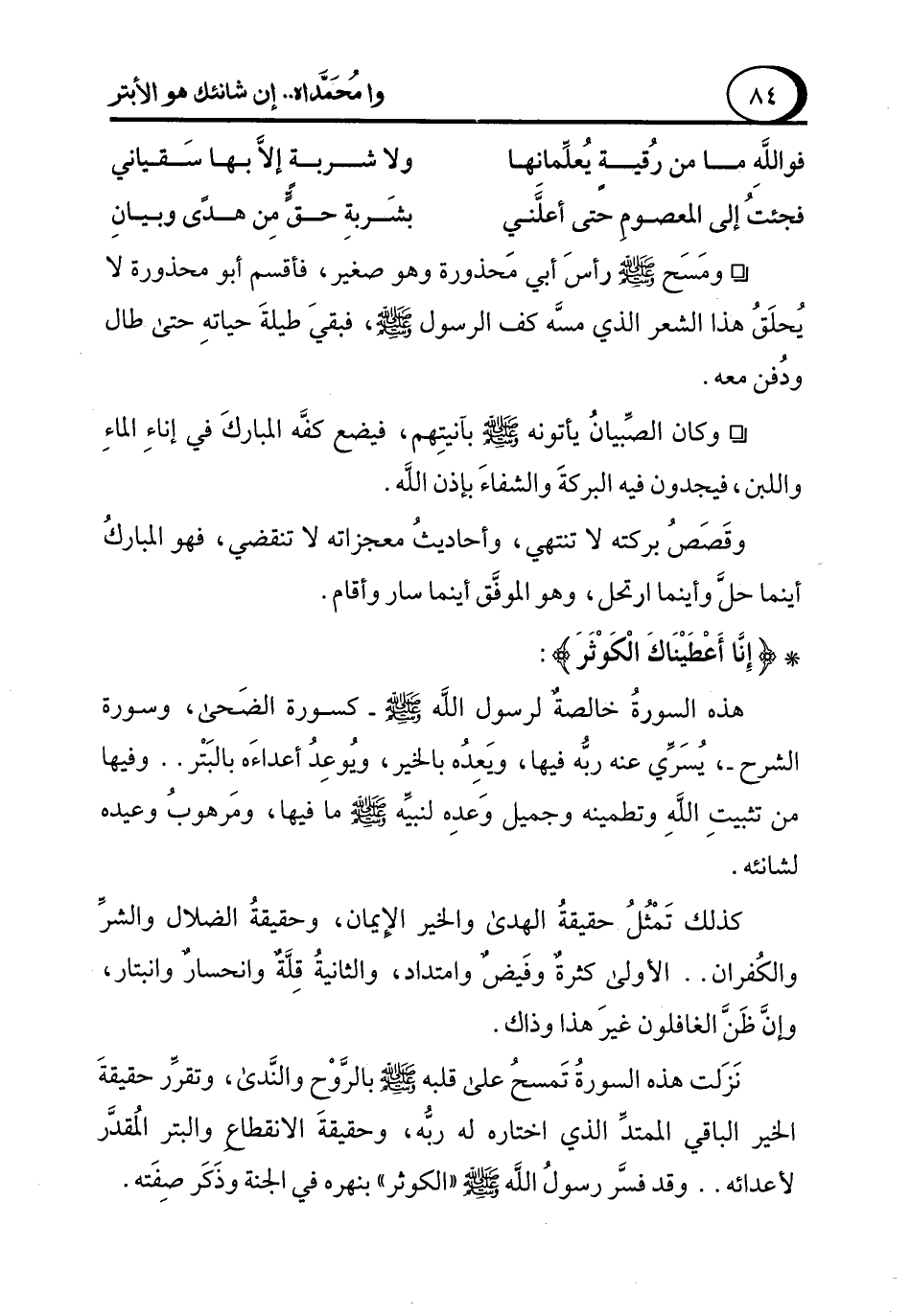 هذه السورةُ خالصة لرسول الله - صلى الله عليه وسلم -كسورة الضَحى، وسورة الشرح-، يُسَرِّي عنه ربُّه فيها، ويَعِدُه بالخير، ويُوعِدُ أعداءَه بالبَتْر .. وفيها من تثبيتِ اللهِ وتطمينه وجميل وَعدِه لنبيِّه - صلى الله عليه وسلم - ما فيها، ومَرهوبُ وعيده لشانئه.