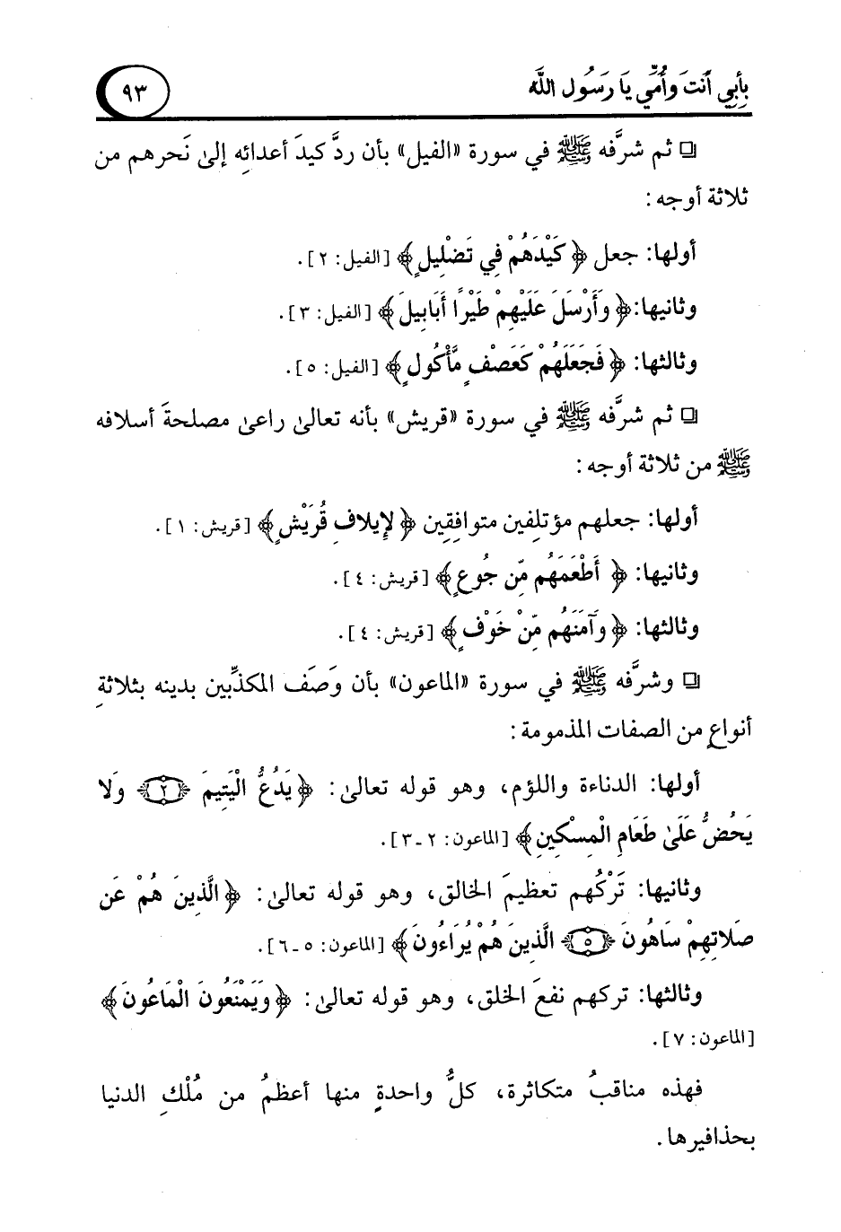 ° وشرفه - صلى الله عليه وسلم - في سورة "الماعون" بأن وَصَف المكذِّبين بدينه بثلاثةِ أنواع من الصفات المذمومة: