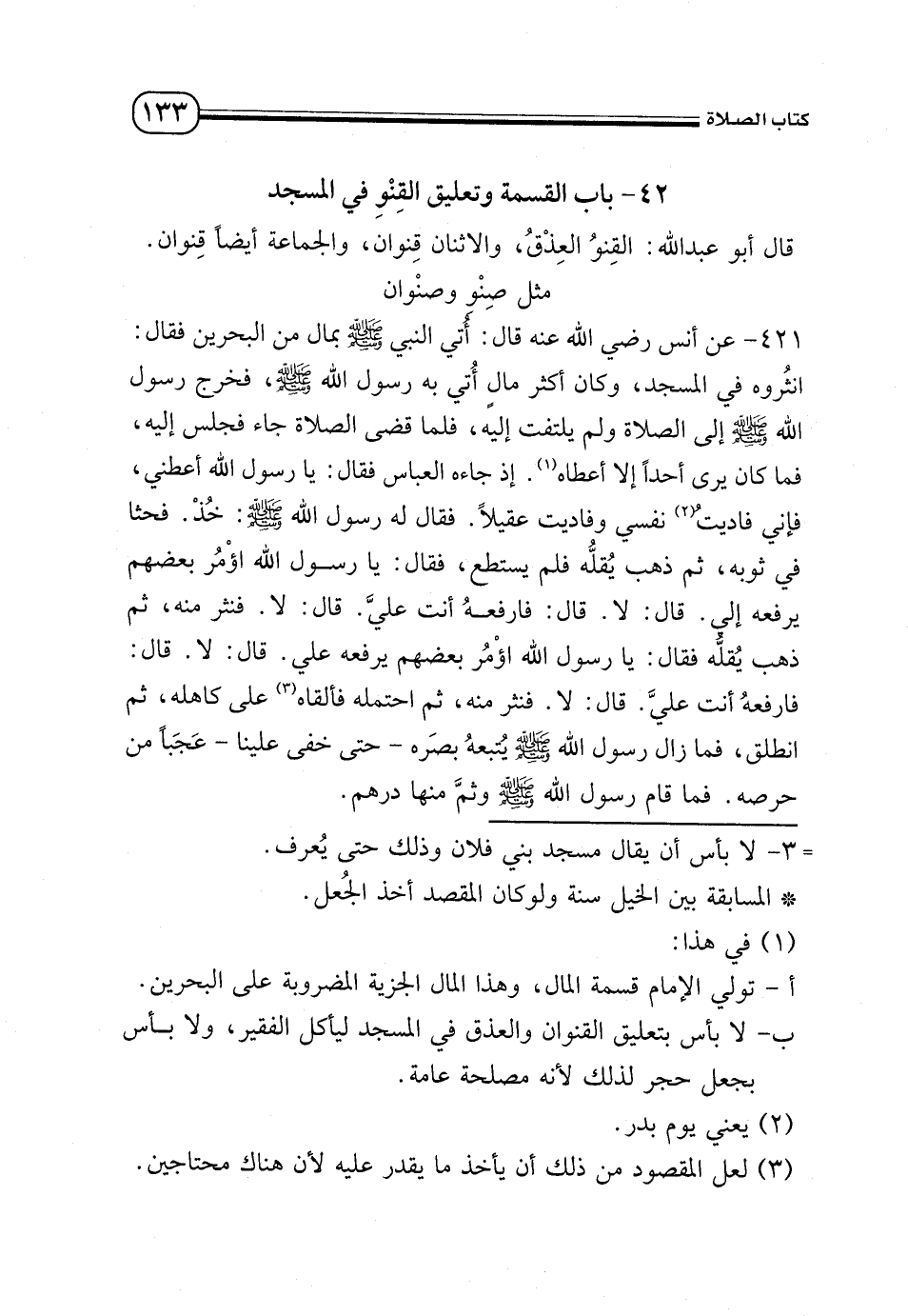 421 - عن أنس - رضي الله عنه - قال: أتى النبي - صلى الله عليه وسلم - بمال من البحرين فقال: «انثروه في المسجد»، وكان أكثر مال أتي به رسول الله - صلى الله عليه وسلم -، فخرج رسول الله - صلى الله عليه وسلم - إلى الصلاة ولم يلتفت إليه، فلما قضى الصلاة جاء فجلس إليه، فما كان يرى أحدا إلا أعطاه (¬1). إذ جاءه العباس فقال: يا رسول الله أعطني، فإني فاديت (¬2) نفسي وفاديت عقيلا. فقال له رسول الله - صلى الله عليه وسلم -: «خذ». فحثا في ثوبه، ثم ذهب يقله فلم يستطع، فقال: يا رسول الله اؤمر بعضهم يرفعه إلى. قال: «لا». قال: فارفعه أنت علي. قال: لا. فنثر منه ثم احتمله فألقاه (¬3) على كاهله، ثم انطلق، فما زال رسول الله - صلى الله عليه وسلم - يتبعه بصره- حتى خفى علينا- عجبا من حرصه- فما قام رسول الله - صلى الله عليه وسلم - وثم منها درهم.
