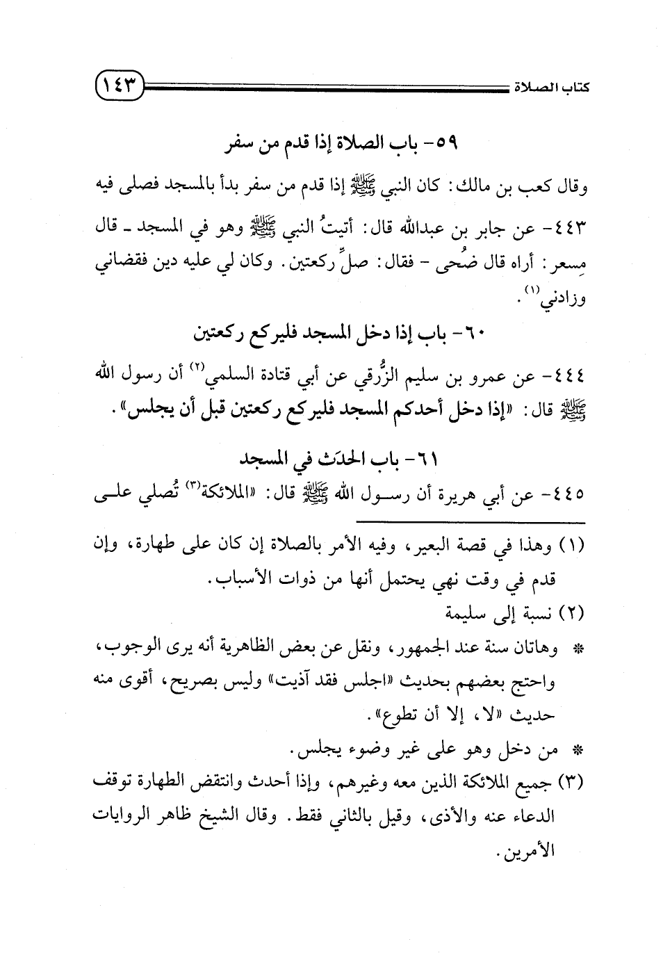 وقال كعب بن مالك: كان النبي - صلى الله عليه وسلم - إذا قدم من سفر بدأ بالمسجد فصلى فيه