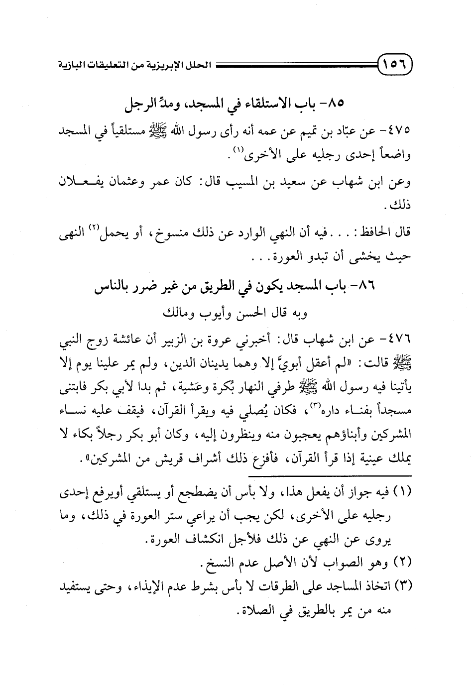 475 - عن عباد بن تميم عن عمه أنه رأى رسول الله - صلى الله عليه وسلم - مستلقيًا في المسجد واضعًا إحدى رجليه على الأخرى (¬1).