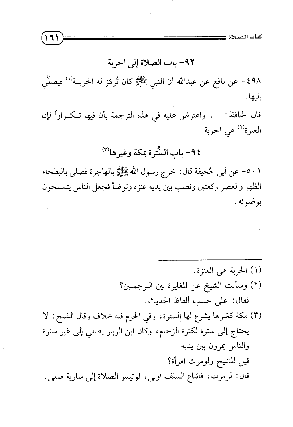 498 - عن نافع عن عبد الله أن النبي - صلى الله عليه وسلم - كان يرتكز له الحربة (¬1)، فيصلي إليها.