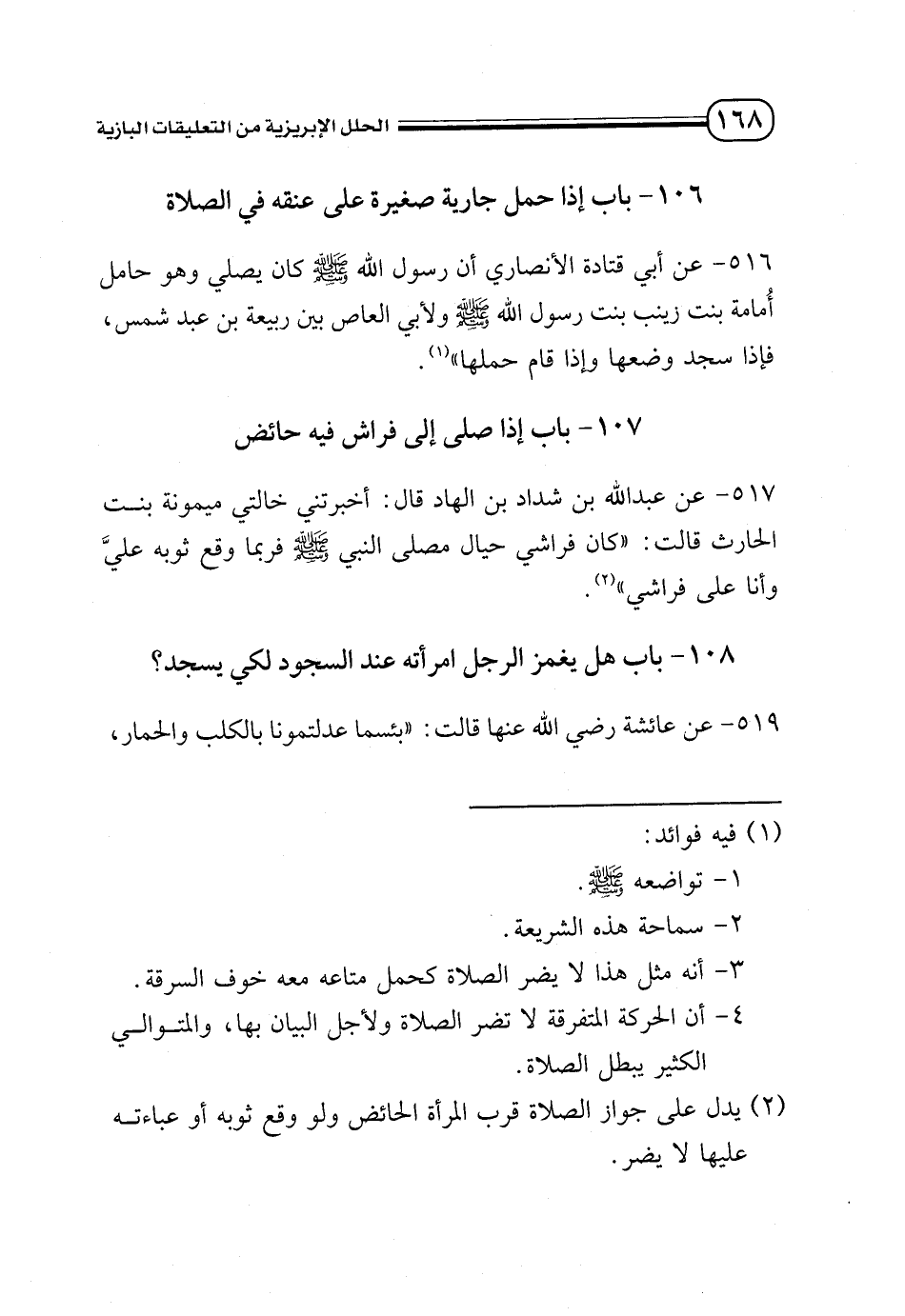 517 - عن عبد الله بن شداد بن الهاد قال: أخبرتني خالتي ميمونة بنت الحارث قالت: «كان فراشي حيال مصلى النبي - صلى الله عليه وسلم - فربما وقع ثوبه علي وأنا على فراشي» (¬2).