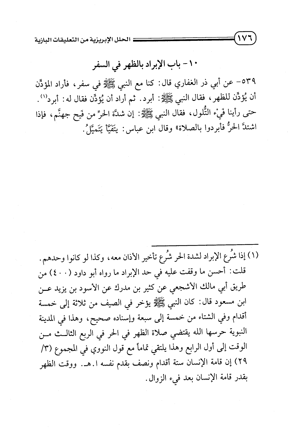 (¬1) إذا شرع الإبراد لشدة الحر شرع تأخير الأذان معه، وكذا لو كانوا وحدهم. قلت: أحسن ما وقفت عليه في حد الإبراد ما رواه أبو داود (400) من طريق أبي مالك الأشجعي عن كثير بن مدرك عن الأسود بن يزيد عن ابن مسعود قال: كان النبي - صلى الله عليه وسلم - يؤخر في الصيف من ثلاثة إلى خمسة أقدام وفي الشتاء من خمسة إلى سبعة وإسناده صحيح، وهذا في المدينة النبوية حرسها الله يقتضي صلاة الظهر في الحر في الربع الثالث من الوقت إلى أول الرابع وهذا يلتقي تمامًا مع قول النووي في المجموع (3/ 29) إن قامة الإنسان ستة أقدام ونصف بقدم نفسه ا. هـ. ووقت الظهر بقدر قامة الإنسان بعد فيء الزوال.