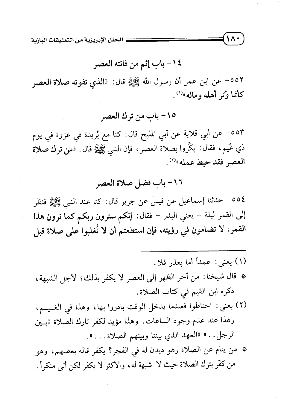 553 - عن أبي قلابة عن أبي المليح قال: كنا مع بريدة في غزوة في يوم ذي غيم، فقال: بكروا بصلاة العصر، فإن النبي - صلى الله عليه وسلم - قال: «من ترك صلاة العصر فقد حبط عمله» (¬2).