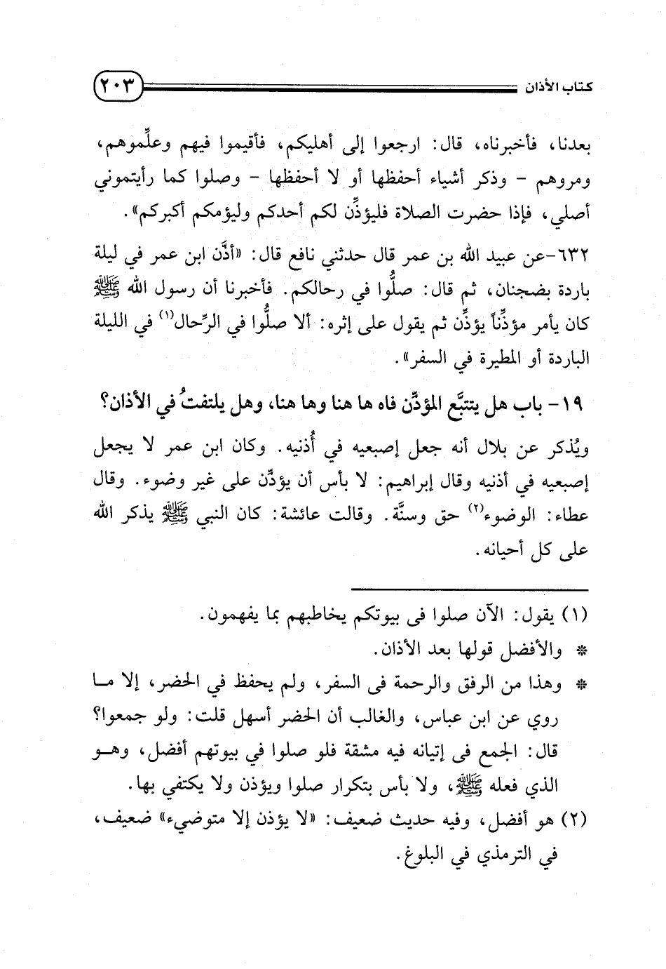 632 - عن عبيد الله بن عمر قال حدثني نافع قال: «أذن ابن عمر في ليلة باردة بضجنان، ثم قال: صلوا في رحالكم. فأخبرنا أن رسول الله - صلى الله عليه وسلم - كان يأمر مؤذنًا يؤذن ثم يقول على إثره: ألا صلوا في الرحال (¬1)