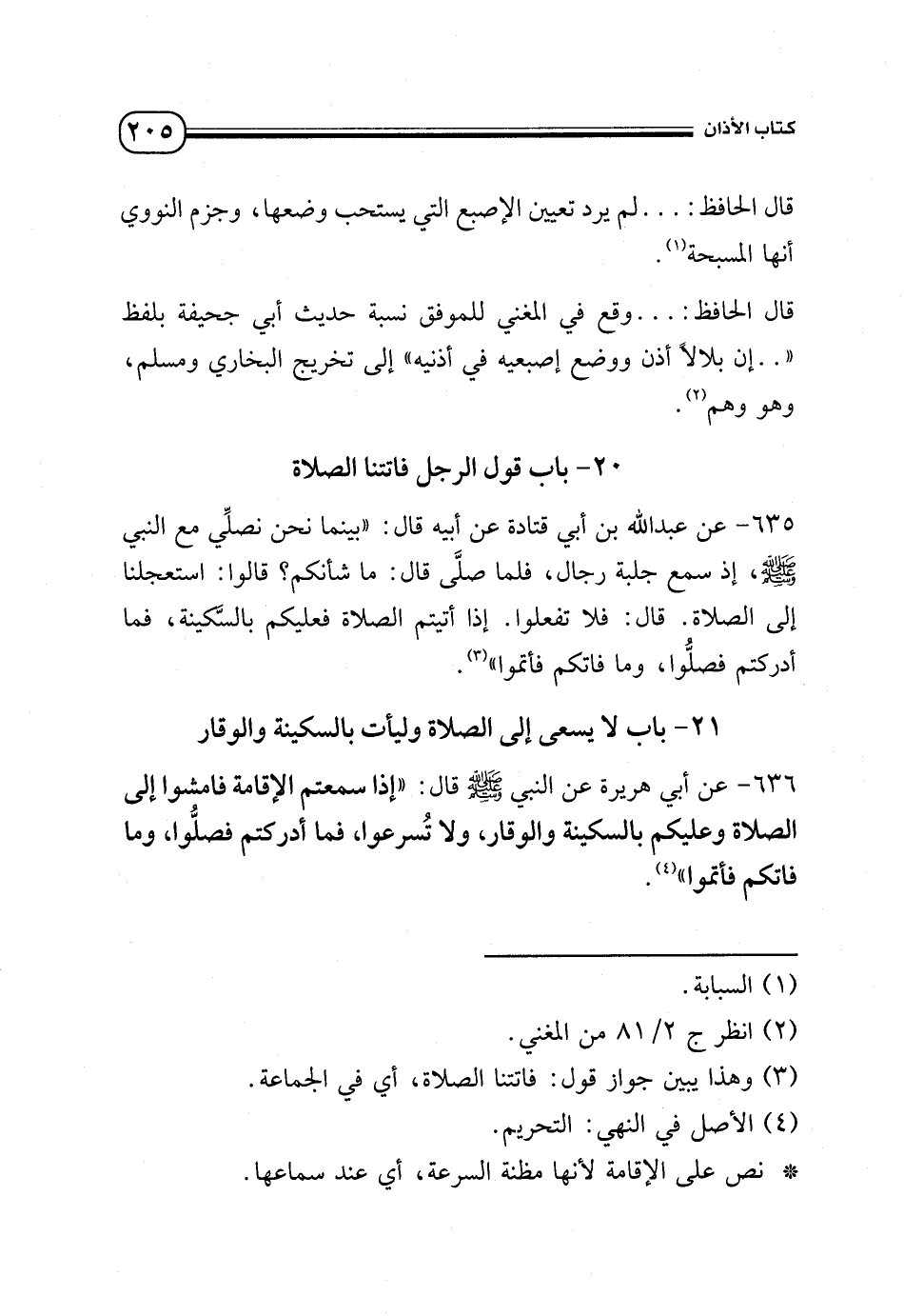 635 - عن عبد الله بن أبي قتادة عن أبيه قال: «بينما نحن نصلي مع النبي - صلى الله عليه وسلم -، إذ سمع جلبة رجال، فلما صلى قال: «ما شأنكم؟ » قالوا: استعجلنا إلى الصلاة. قال: «فلا تفعلوا. إذا أتيتم الصلاة فعليكم بالسكينة، فما أدركتم فصلوا، وما فاتكم فأتموا» (¬3).