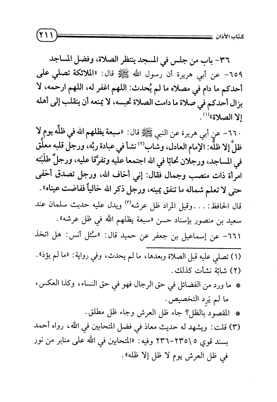 660 - عن أبي هريرة عن النبي - صلى الله عليه وسلم - قال: «سبعة يظلهم الله في ظله يوم لا ظل إلا ظله: الإمام العادل، وشاب (¬2) نشأ في عبادة ربه، ورجل قلبه معلق في المساجد، ورجلان تحابا في الله اجتمعا عليه وتفرقا عليه، ورجل طلبته امرأة ذات منصب وجمال فقال: إني أخاف الله، ورجل تصدق أخفى حتى لا تعلم شماله ما تنفق يمينه، ورجل ذكر الله خاليًا ففاضت عيناه».