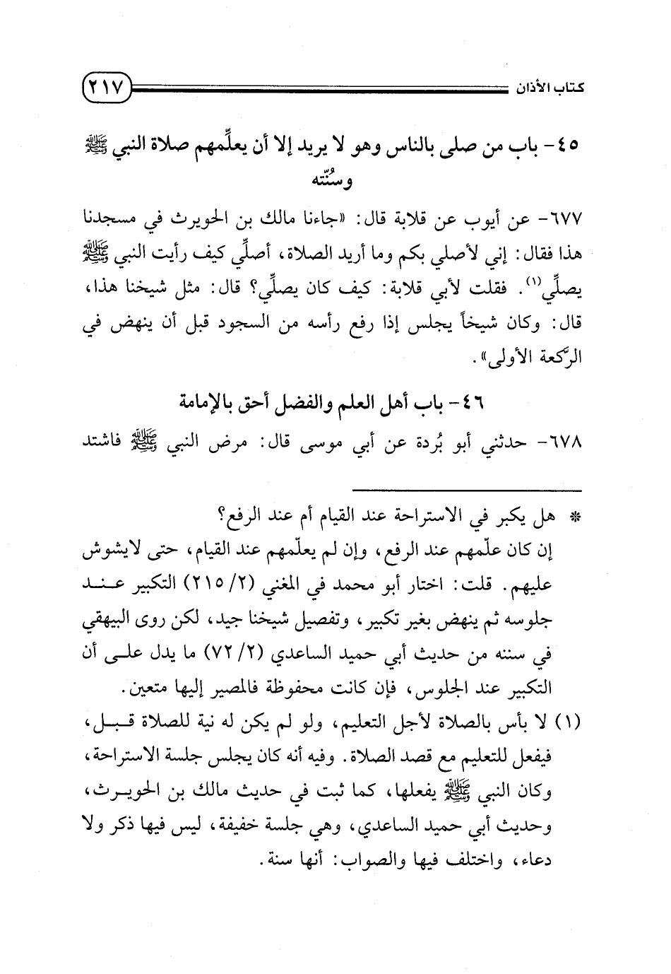 (¬1) لا بأس بالصلاة لأجل التعليم، ولو لم يكن له نية للصلاة قبل، فيفعل للتعليم مع قصد الصلاة. وفيه أنه كان يجلس جلسة الاستراحة، وكان النبي - صلى الله عليه وسلم - يفعلها، كما ثبت في حديث مالك بن الحويرث، وحديث أبي حميد الساعدي، وهي جلسة خفيفة، ليس فيها ذكر ولا دعاء، واختلف فيها والصواب: أنها سنة.