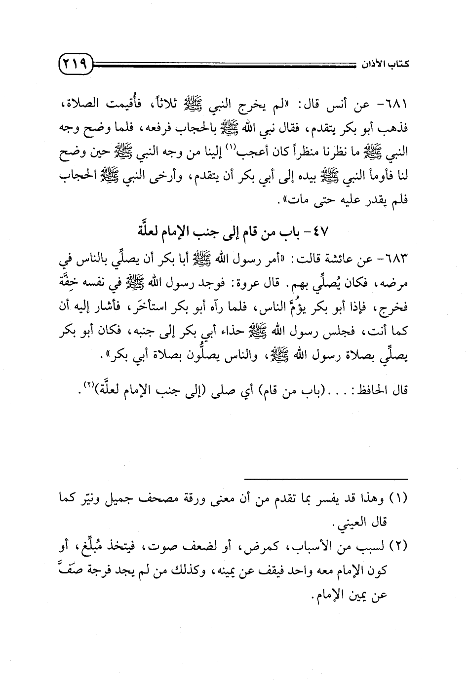 683 - عن عائشة قالت: «أمر رسول الله - صلى الله عليه وسلم - أبا بكر أن يصلي بالناس في مرضه، فكان يصلي بهم. قال عروة: فوجد رسول الله - صلى الله عليه وسلم - في نفسه خفة فخرج، فإذا أبو بكر يؤم الناس، فلما رآه أبو بكر استأخر، فأشار إليه أن كما أنت، فجلس رسول الله - صلى الله عليه وسلم - حذاء أبي بكر إلى جنبه، فكان أبو بكر يصلي بصلاة رسول الله - صلى الله عليه وسلم -، والناس يصلون بصلاة أبي بكر».