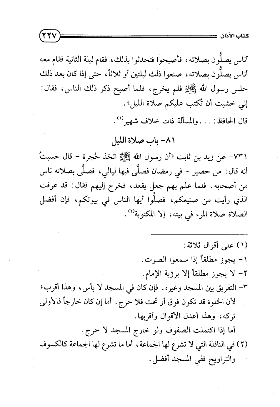 731 - عن زيد بن ثابت «أن رسول الله - صلى الله عليه وسلم - اتخذ حجرة -قال حسبت أنه قال: من حصير- في رمضان فصلى فيها ليالي، فصلى بصلاته ناس من أصحابه. فلما علم بهم جعل يقعد، فخرج إليهم فقال: «قد عرفت الذي رأيت من صنيعكم، فصلوا أيها الناس في بيوتكم، فإن أفضل الصلاة صلاة المرء في بيته، إلا المكتوبة» (¬2).