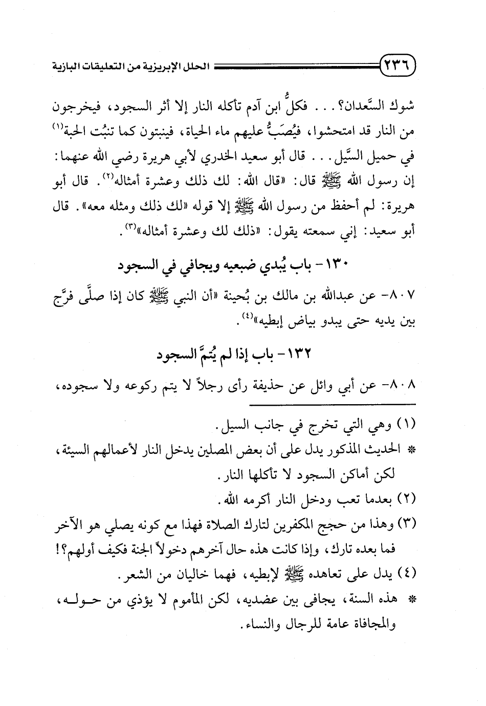 807 - عن عبد الله بن مالك بن بحينة «أن النبي - صلى الله عليه وسلم - كان إذا صلى فرج بين يديه حتى يبدو بياض إبطيه» (¬4).