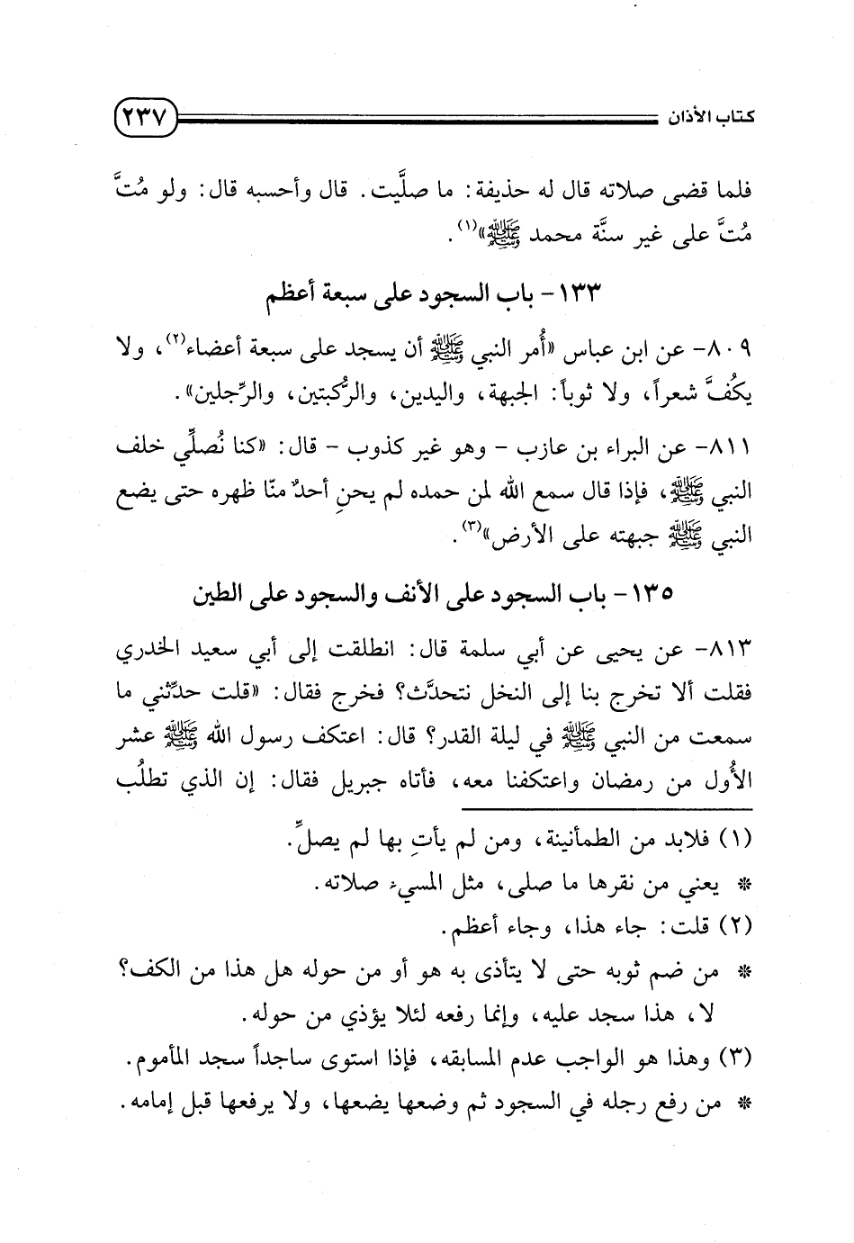 809 - عن ابن عباس «أمر النبي - صلى الله عليه وسلم - أن يسجد على سبعة أعضاء (¬2)، ولا يكف شعرًا، ولا ثوبًا: الجبهة، واليدين، والركبتين، والرجلين».