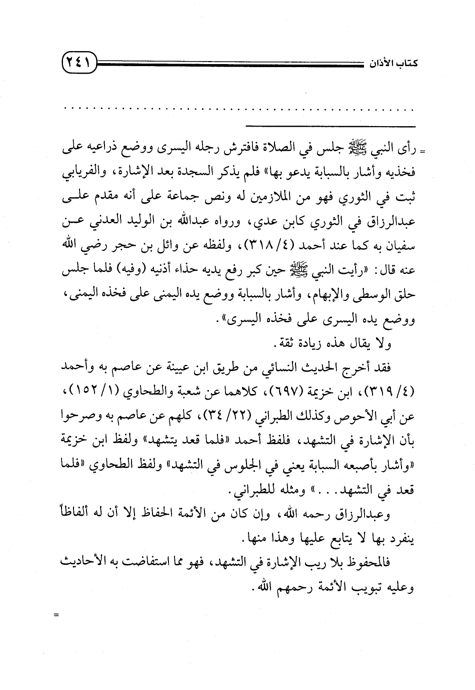 = رأى النبي - صلى الله عليه وسلم - جلس في الصلاة فافترش رجله اليسرى ووضع ذراعيه على فخذيه وأشار بالسبابة يدعو بها» فلم يذكر السجدة بعد الإشارة، والفريابي ثبت في الثوري فهو من الملازمين له ونص جماعة على أنه مقدم على عبد الرزاق في الثوري كابن عدي، ورواه عبد الله بن الوليد العدني عن سفيان به كما عند أحمد (4/ 318)، ولفظه عن وائل بن حجر - رضي الله عنه - قال: «رأيت النبي - صلى الله عليه وسلم - حين كبر رفع يديه حذاء أذنيه (وفيه) فلما جلس حلق الوسطى والإبهام، وأشار بالسبابة ووضع يده اليسرى على فخذه اليسرى».