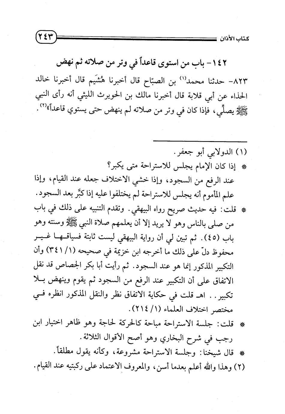 823 - حدثنا محمد (¬1) بن الصباح قال أخبرنا هشيم قال أخبرنا خالد الحذاء عن أبي قلابة قال أخبرنا مالك بن الحويرث الليثي أنه رأى النبي - صلى الله عليه وسلم - يصلي، فإذا كان في وتر من صلاته لم ينهض حتى يستوي قاعدًا» (¬2).