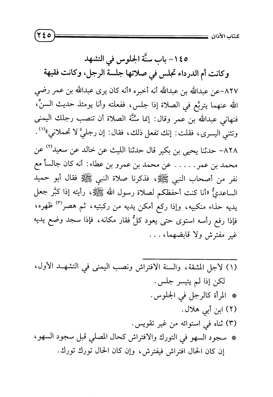 827 - عن عبد الله بن عبد الله أنه أخبره «أنه كان يرى عبد الله بن عمر - رضي الله عنهم - يتربع في الصلاة إذا جلس، ففعلته وأنا يومئذ حديث السن، فنهاني عبد الله بن عمر وقال: إنما سنة الصلاة أن تنصب رجلك اليمنى وتثني اليسرى، فقلت: إنك تفعل ذلك، فقال: إن رجلي لا تحملاني» (¬1).