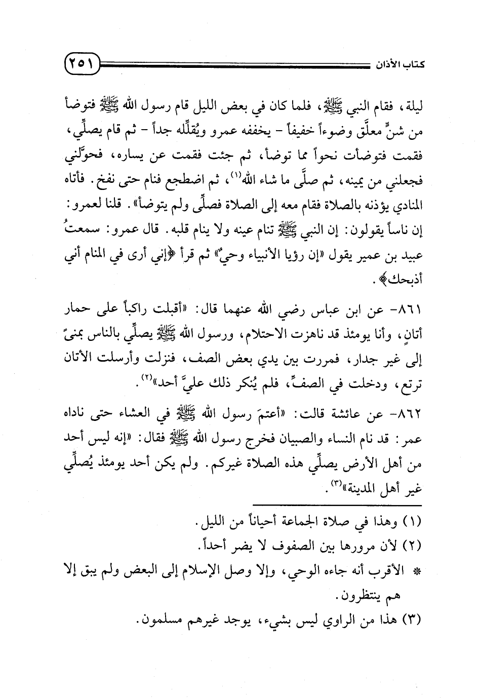 861 - عن ابن عباس - رضي الله عنهم - قال: «أقبلت راكبًا على حمار أتانٍ، وأنا يومئذ قد ناهزت الاحتلام، ورسول الله - صلى الله عليه وسلم - يصلي بالناس بمنى إلى غير جدار، فمررت بين يدي بعض الصف، فنزلت وأرسلت الأتان ترتع، ودخلت في الصف، فلم ينكر ذلك على أحد» (¬2).