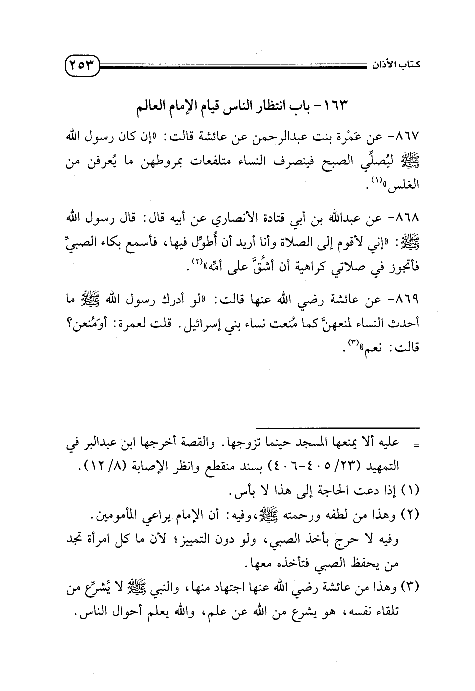 869 - عن عائشة - رضي الله عنها - قالت: «لو أدرك رسول الله - صلى الله عليه وسلم - ما أحدث النساء لمنعهن كما منعت نساء بني إسرائيل. قلت لعمرة: أو منعن؟ قالت: نعم» (¬3).