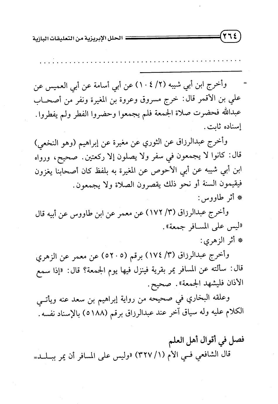 = وأخرج ابن أبي شيبه (2/ 104) عن أبي أسامة عن أبي العميس عن علي بن الأقمر قال: خرج مسروق وعروة بن المغيرة ونفر من أصحاب عبد الله فحضرت صلاة الجمعة فلم يجمعوا وحضروا الفطر ولم يفطروا. إسناده ثابت.