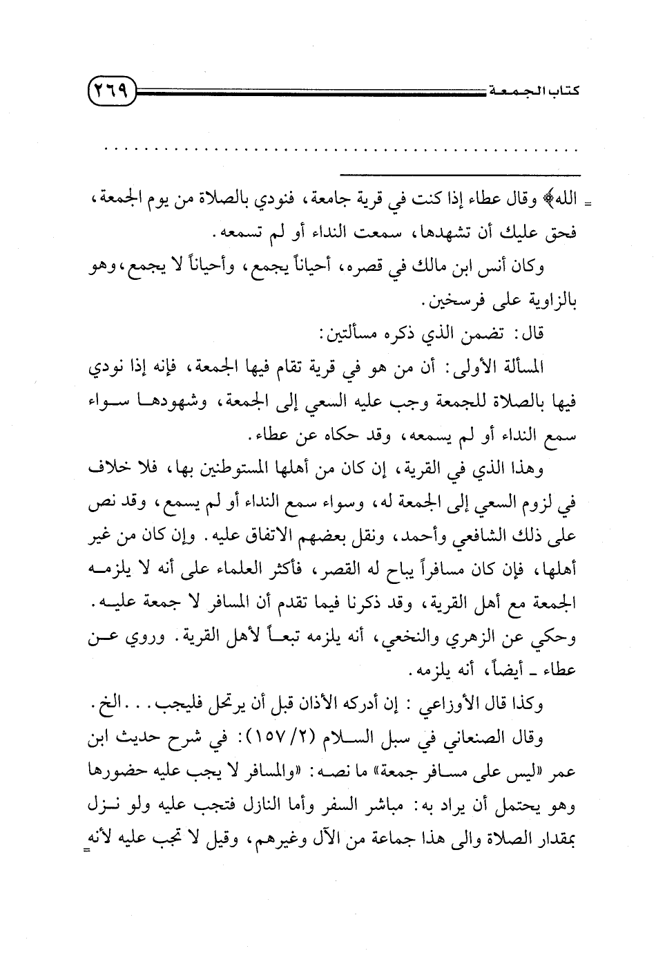 وقال الصنعاني في سبل السلام (2/ 157): في شرح حديث ابن عمر «ليس على مسافر جمعة» ما نصه: «والمسافر لا يجب عليه حضورها وهو يحتمل أن يراد به: مباشر السفر وأما النازل فتجب عليه ولو نزل بمقدار الصلاة والى هذا جماعة من الآل وغيرهم، وقيل لا تجب عليه لأنه =