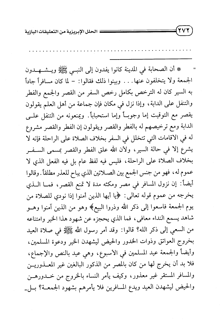 = * أن الصحابة في المدينة كانوا يفدون إلى النبي - صلى الله عليه وسلم - ويشهدون الجمعة ولا يتخلفون عنها ... وبينوا ذلك فقالوا: - لما كان مسافرًا جادًا به السير كان له الترخص بكامل رخص السفر من القصر والجمع والفطر والتنفل على الدابة، وإذا نزل في مكان فإن جماعة من أهل العلم يقولون يقصر مع التوقيت إما وجوبًا وإما استحبابًا. ويمنعونه من التنفل على الدابة ومع ترخيصهم له بالفطر والقصر ويقولون إن الفطر والقصر مشروع له في الإقامات التي تتخلل في السفر بخلاف الصلاة على الراحلة فإنه لا يشرع إلا في حالة السير، ولأن الله علق الفطر والقصر بمسمى السفر بخلاف الصلاة على الراحلة، فليس فيه لفظ عام بل فيه الفعل الذي لا عموم له، فهو من جنس الجمع بين الصلاتين الذي يباح للعذر مطلقًا. وقالوا أيضًا: إن نزول المسافر في مصر ومكثه مدة لا تمنع القصر، فما الذي يخرجه من عموم قوله تعالى: {يَاأَيُّهَا الَّذِينَ آمَنُوا إِذَا نُودِيَ لِلصَّلَاةِ مِنْ يَوْمِ الْجُمُعَةِ فَاسْعَوْا إِلَى ذِكْرِ اللَّهِ وَذَرُوا الْبَيْعَ} وهو من الذين آمنوا وهو شاهد يسمع النداء معافى، فما الذي يحجزه عن شهود هذا الخير وامتناعه من السعي إلى ذكر الله؟ قالوا: وقد أمر رسول الله - صلى الله عليه وسلم - في صلاة العيد بخروج العواتق وذوات الخدور والحيض ليشهدن الخير ودعوة المسلمين، وأيضًا والجمعة عيد المسلمين في الأسبوع، وهي عيد بالنص والإجماع، فلا بد أن يخرج لها من كان بالمصر من الذكور البالغين غير المعذورين والمسافر المستقر غير معذور، وكيف يأمر النساء بالخروج من خدورهن والحيض ليشهدن العيد ويدع المسافرين فلا يأمرهم بشهود الجمعة؟ بل =