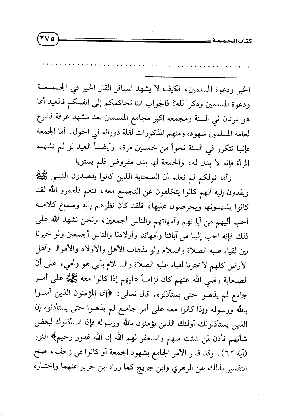 وأما قولكم لم نعلم أن الصحابة الذين كانوا يقصدون النبي - صلى الله عليه وسلم - ويفدون إليه أنهم كانوا يتخلفون عن التجميع معه، فنعم فلعمرو الله لقد كانوا يشهدونها ويحرصون عليها، فلقد كان نظرهم إليه وسماع كلامه أحب أليهم من آبائهم وأمهاتهم والناس أجمعين، ونحن نشهد الله على ذلك فإنه أحب إلينا من آبائنا وأمهاتنا وأولادنا والناس أجمعين ولو خيرنا بين لقياه - صلى الله عليه وسلم - ولو بذهاب الأهل والأولاد والأموال وأهل الأرض كلهم لاخترنا لقياه - صلى الله عليه وسلم - بأبي هو وأمي، على أن الصحابة - رضي الله عنهم - كان لزامًا عليهم إذا كانوا معه - صلى الله عليه وسلم - على أمر جامع لم يذهبوا حتى يستأذنوه، قال تعالى: {إِنَّمَا الْمُؤْمِنُونَ الَّذِينَ آمَنُوا بِاللَّهِ وَرَسُولِهِ وَإِذَا كَانُوا مَعَهُ عَلَى أَمْرٍ جَامِعٍ لَمْ يَذْهَبُوا حَتَّى يَسْتَأْذِنُوهُ إِنَّ الَّذِينَ يَسْتَأْذِنُونَكَ أُولَئِكَ الَّذِينَ يُؤْمِنُونَ بِاللَّهِ وَرَسُولِهِ فَإِذَا اسْتَأْذَنُوكَ لِبَعْضِ شَأْنِهِمْ فَأْذَنْ لِمَنْ شِئْتَ مِنْهُمْ وَاسْتَغْفِرْ لَهُمُ اللَّهَ إِنَّ اللَّهَ غَفُورٌ رَحِيمٌ} [النور: 62]. وقد فسر الأمر الجامع بشهود الجمعة أو كانوا في زحف، صح التفسير بذلك عن الزهري وابن جريج كما رواه ابن جرير عنهما واختاره =