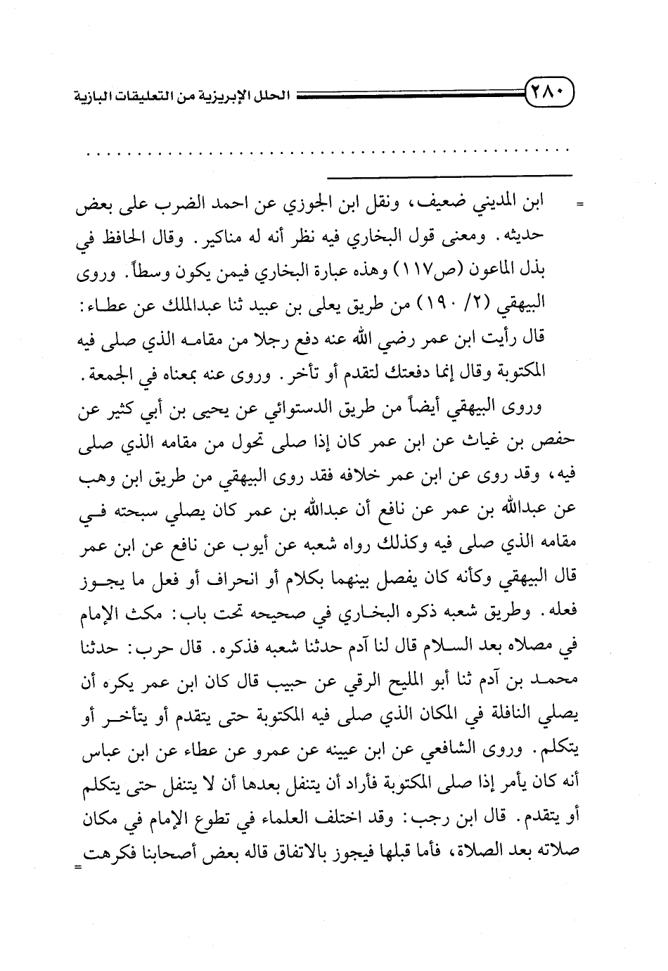 وروى البيهقي أيضًا من طريق الدستوائي عن يحيى بن أبي كثير عن حفص بن غياث عن ابن عمر كان إذا صلى تحول من مقامه الذي صلى فيه، وقد روى عن ابن عمر خلافه فقد روى البيهقي من طريق ابن وهب عن عبد الله بن عمر عن نافع أن عبد الله بن عمر كان يصلي سبحته في مقامه الذي صلى فيه وكذلك رواه شعبه عن أيوب عن نافع عن ابن عمر قال البيهقي وكأنه كان يفصل بينهما بكلام أو انحراف أو فعل ما يجوز فعله. وطريق شعبه ذكره البخاري في صحيحه تحت باب: مكث الإمام في مصلاه بعد السلام قال لنا آدم حدثنا شعبه فذكره. قال حرب: حدثنا محمد بن آدم ثنا أبو المليح الرقي عن حبيب قال كان ابن عمر يكره أن يصلي النافلة في المكان الذي صلى فيه المكتوبة حتى يتقدم أو يتأخر أو يتكلم. وروى الشافعي عن ابن عيينه عن عمرو عن عطاء عن ابن عباس أنه كان يأمر إذا صلى المكتوبة فأراد أن يتنفل بعدها أن لا يتنفل حتى يتكلم أو يتقدم. قال ابن رجب: وقد اختلف العلماء في تطوع الإمام في مكان صلاته بعد الصلاة، فأما قبلها فيجوز بالاتفاق قاله بعض أصحابنا فكرهت =