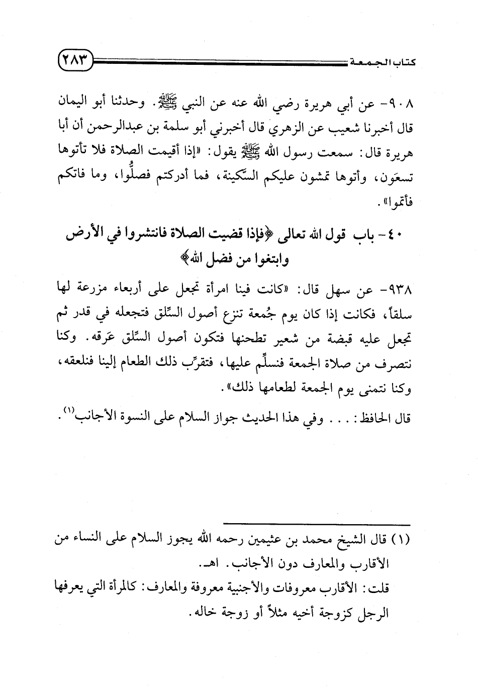 938 - عن سهل قال: «كانت فينا امرأة تجعل على أربعاء مزرعة لها سلقًا، فكانت إذا كان يوم جمعة تنزع أصول السلق فتجعله في قدر ثم تجعل عليه قبضة من شعير تطحنها فتكون أصول السلق عرقه. وكنا ننصرف من صلاة الجمعة فنسلم عليها، فتقرب ذلك الطعام إلينا فنلعقه، وكنا نتمنى يوم الجمعة لطعامها ذلك».