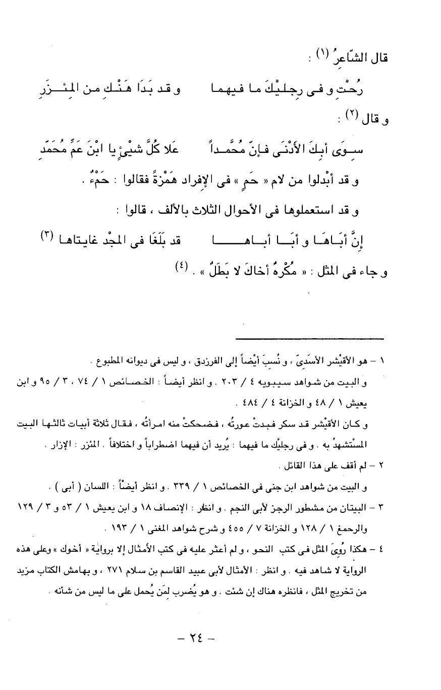 (¬4) - هكذا روى المثل فى كتب النحو، ولم أعثر عليه فى كتب الأمثال إلا برواية «أخوك» وعلى هذه الرواية لا شاهد فيه. وانظر: الأمثال لأبى عبيد القاسم بن سلام 271، وبهامش الكتاب مزيد من تخريج المثل، فانظره هناك إن شئت. وهو يضرب لمن يحمل على ما ليس من شأنه.