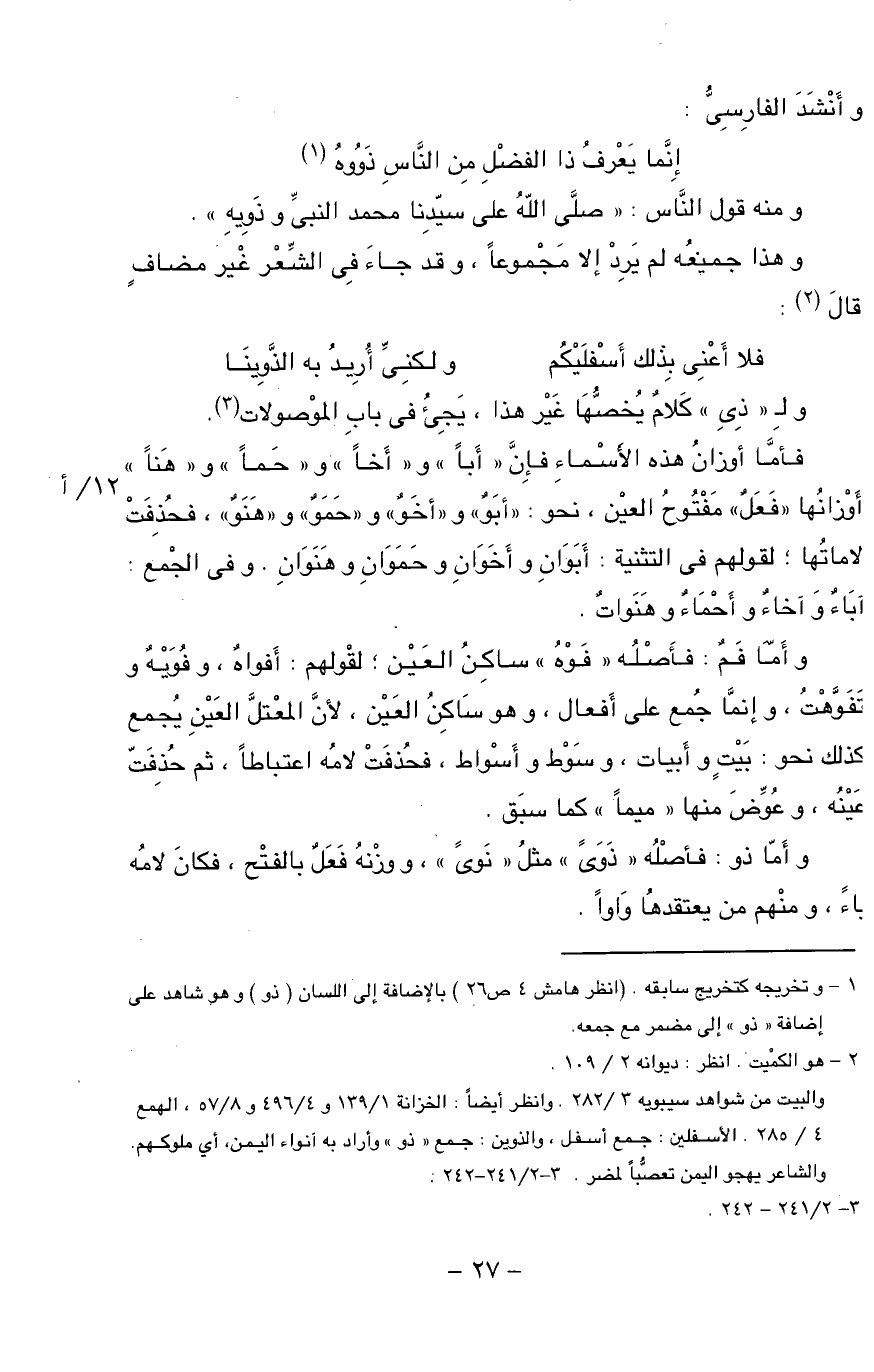 (¬1) - وتخريجه كتخريج سابقه. (انظر هامش 4 ص 26) بالإضافة إلى اللسان (ذو) وهو شاهد على إضافة «ذو» إلى مضمر مع جمعه.