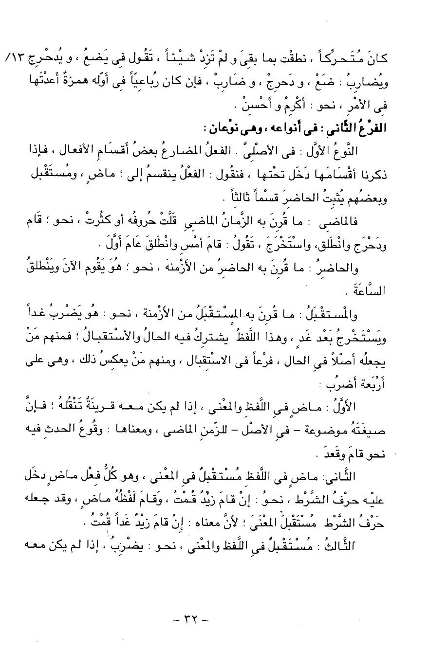 الثّانى: ماض فى اللّفظ مستقبل فى المعنى، وهو كلّ فعل ماض دخل عليه حرف الشّرط، نحو: إن قام زيد قمت، وقام لفظه ماض، وقد جعله حرف الشّرط مستقبل المعنى؛ لأنّ معناه: إن قام زيد غدا قمت.