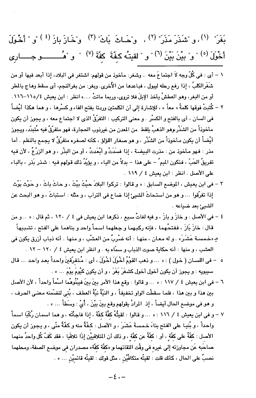 بغر" (¬1)، و" شذر مذر" (¬2)، و" حاث باث" (¬3) و" خاز باز (¬4) " و" أخول أخول (¬5) "، و" بين بين (¬6) " و" لقيته كفّة كفّة (¬7) " و" هو جارى