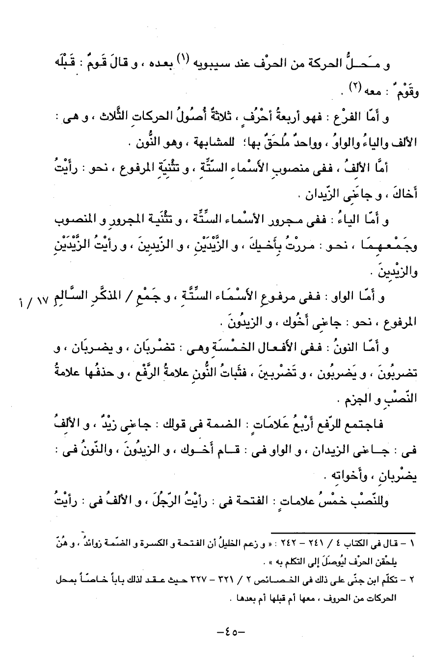 (¬1) - قال فى الكتاب 4/ 241 - 242: «وزعم الخليل أن الفتحة والكسرة والضّمة زوائد، وهنّ يلحقن الحرف ليوصل إلى التكلم به».