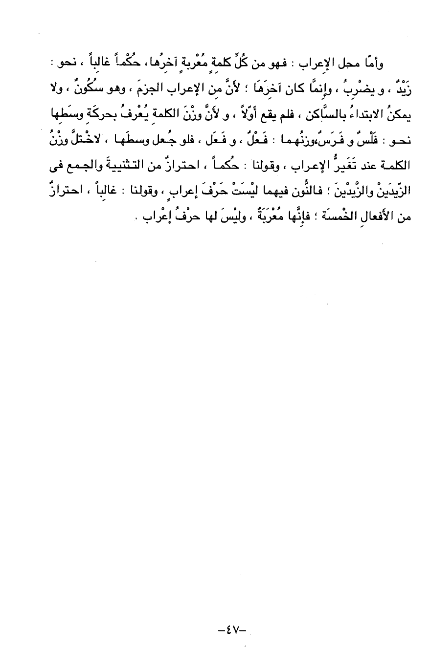 زيد، ويضرب، وإنمّا كان آخرها؛ لأنّ من الإعراب الجزم، وهو سكون، ولا يمكن الابتداء بالسّاكن، فلم يقع أوّلا، ولأنّ وزن الكلمة يعرف بحركة وسطها نحو: فلس وفرس، وزنهما: فعل، وفعل، فلو جعل وسطها، لاختلّ وزن الكلمة عند تغيرّ الإعراب، وقولنا: حكما، احتراز من التثنيية والجمع فى الزّيدين والزّيدين؛ فالنّون فيهما ليست حرف إعراب، وقولنا: غالبا، احتراز من الأفعال الخمسة؛ فإنّها معربة، وليس لها حرف إعراب.