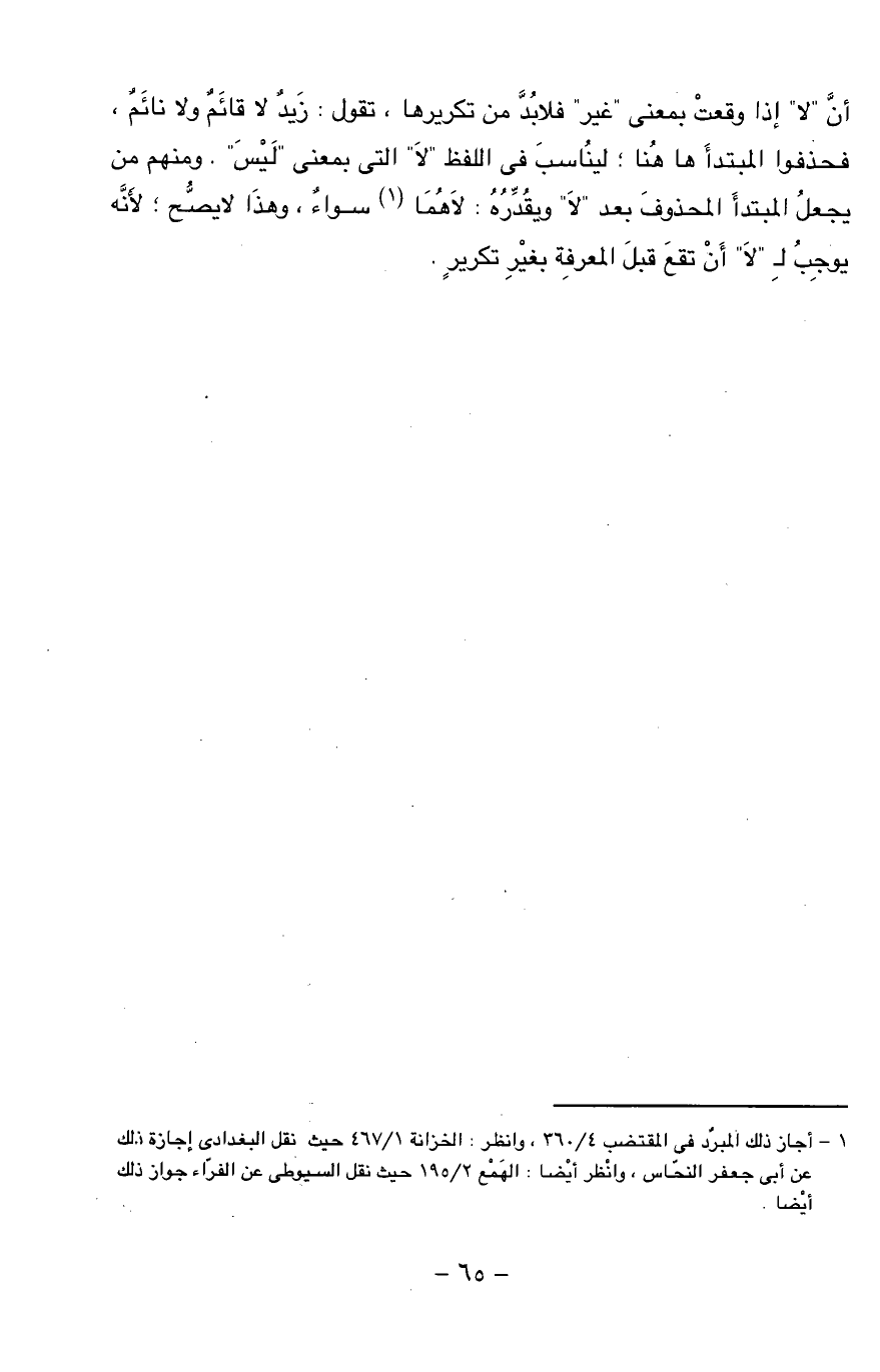 أنّ" لا" إذا وقعت بمعنى" غير" فلا بدّ من تكريرها، تقول: زيد لا قائم ولا نائم، فحذفوا المبتدأ ها هنا؛ ليناسب فى اللفظ" لا" التى بمعنى" ليس". ومنهم من يجعل المبتدأ المحذوف بعد" لا" ويقدّره: لا هما (¬1) سواء، وهذا لا يصحّ؛ لأنّه يوجب ل" لا" أن تقع قبل المعرفة بغير تكرير.