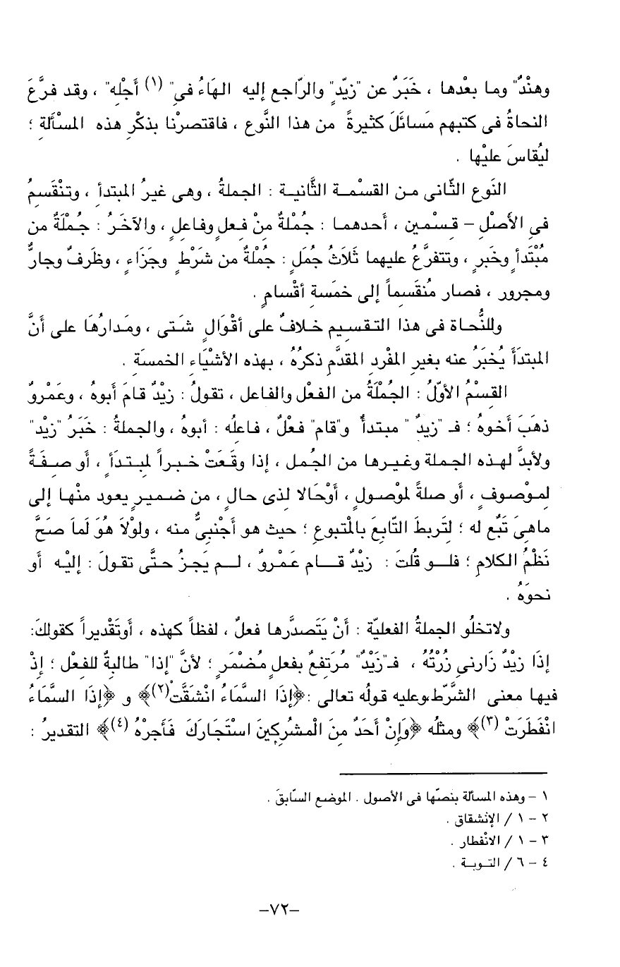 القسم الأوّل: الجملة من الفعل والفاعل، تقول: زيد قام أبوه، وعمرو ذهب أخوه؛ ف" زيد" مبتدأ و" قام" فعل، فاعله: أبوه، والجملة: خبر" زيد" ولا بدّ لهذه الجملة وغيرها من الجمل، إذا وقعت خبرا لمبتدأ، أو صفة لموصوف، أو صلة لموصول، أو حالا لذى حال، من ضمير يعود منها إلى ماهى تبع له؛ لتربط التّابع بالمتبوع؛ حيث هو أجنبىّ منه، ولولا هو لما صحّ نظم الكلام؛ فلو قلت: زيد قام عمرو، لم يجز حتّى تقول: إليه أو نحوه.