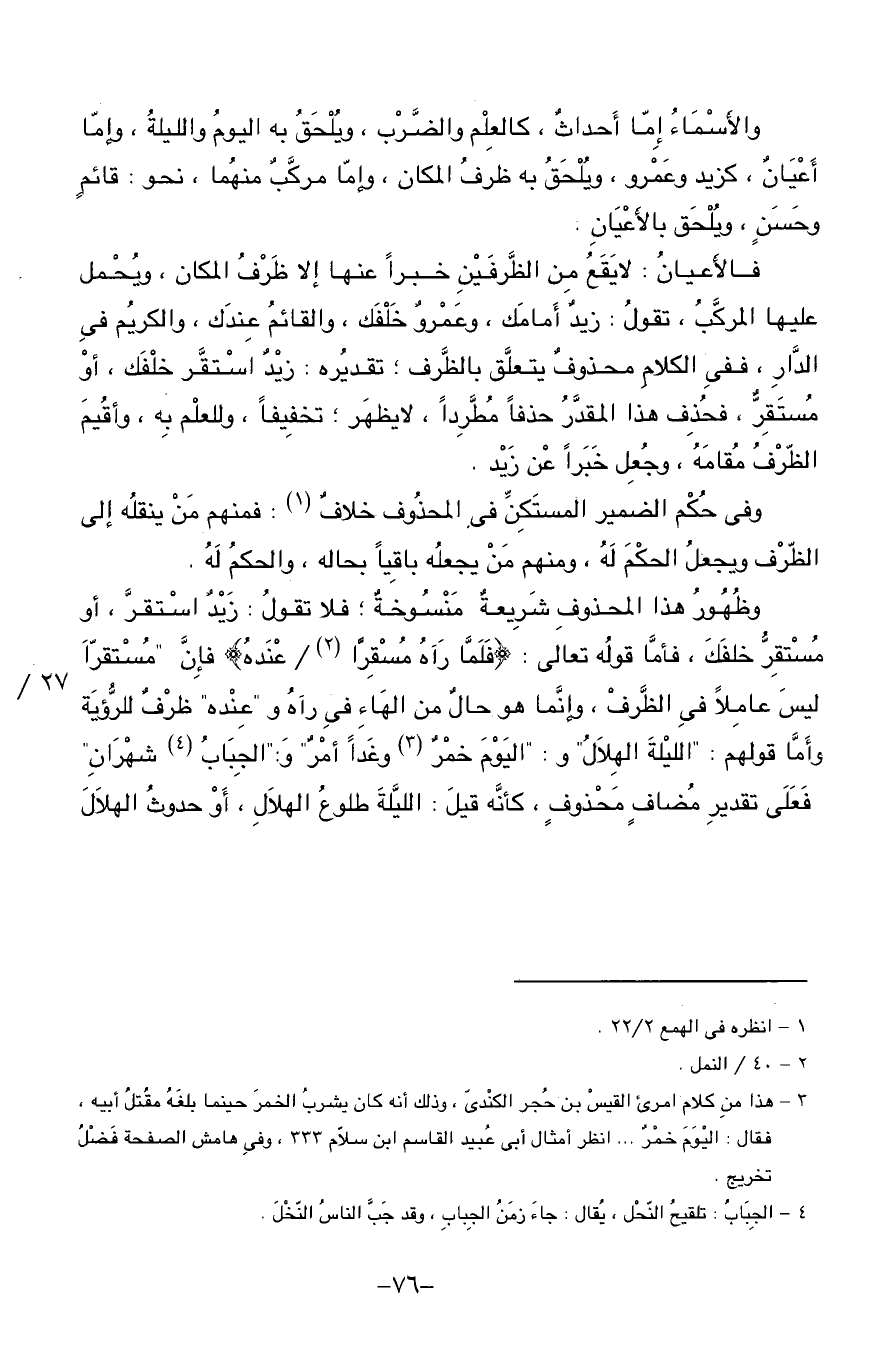 وظهور هذا المحذوف شريعة منسوخة؛ فلا تقول: زيد استقرّ، أو مستقرّ خلفك، فأمّا قوله تعالى: فَلَمَّا رَآهُ مُسْتَقِرًّا/ عِنْدَهُ (¬2) فإنّ" مستقرّا ليس عاملا فى الظّرف، وإنّما هو حال من الهاء فى رآه و" عنده" ظرف للرّؤية وأمّا قولهم:" الليلة الهلال" و:" اليوم خمر (¬3) وغدا أمر" و:" الجباب (¬4) شهران" فعلى تقدير مضاف محذوف، كأنّه قيل: الليّلة طلوع الهلال، أو حدوث الهلال