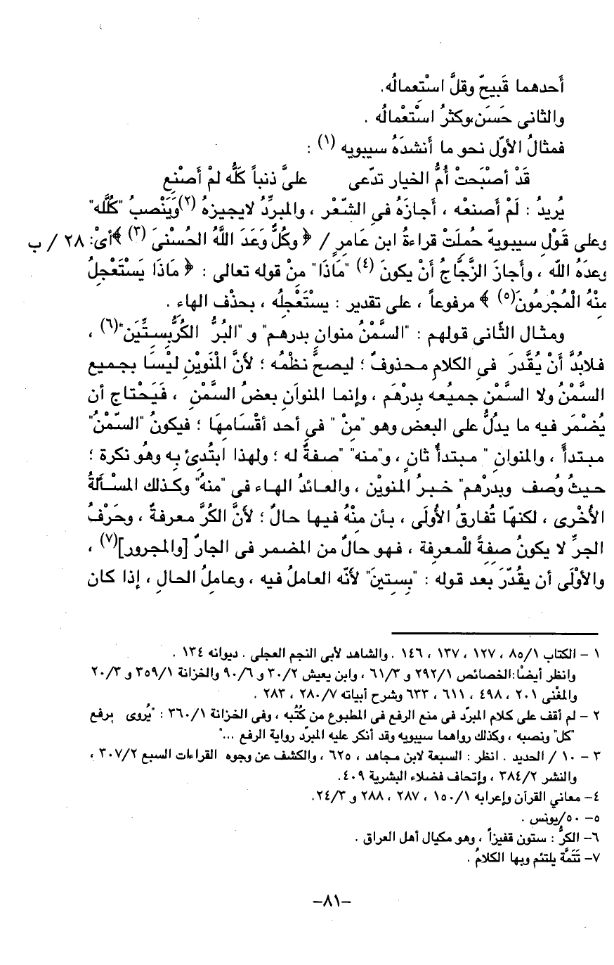 وانظر أيضا: الخصائص 1/ 292 و 3/ 61، وابن يعيش 2/ 30 و 6/ 90 والخزانة 1/ 359 و 3/ 20 والمغنى 201، 498، 611، 633 وشرح أبياته 7/ 280، 283.